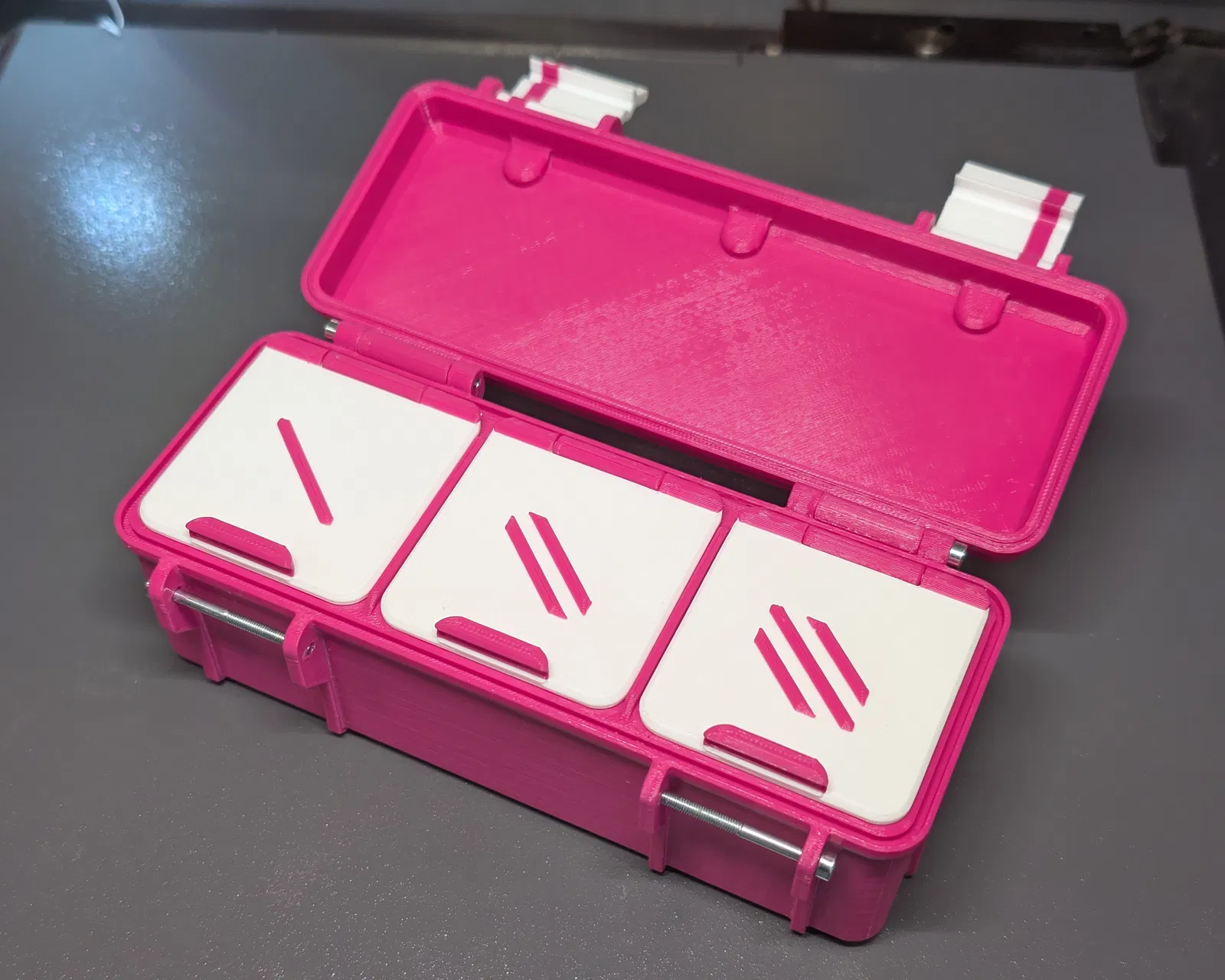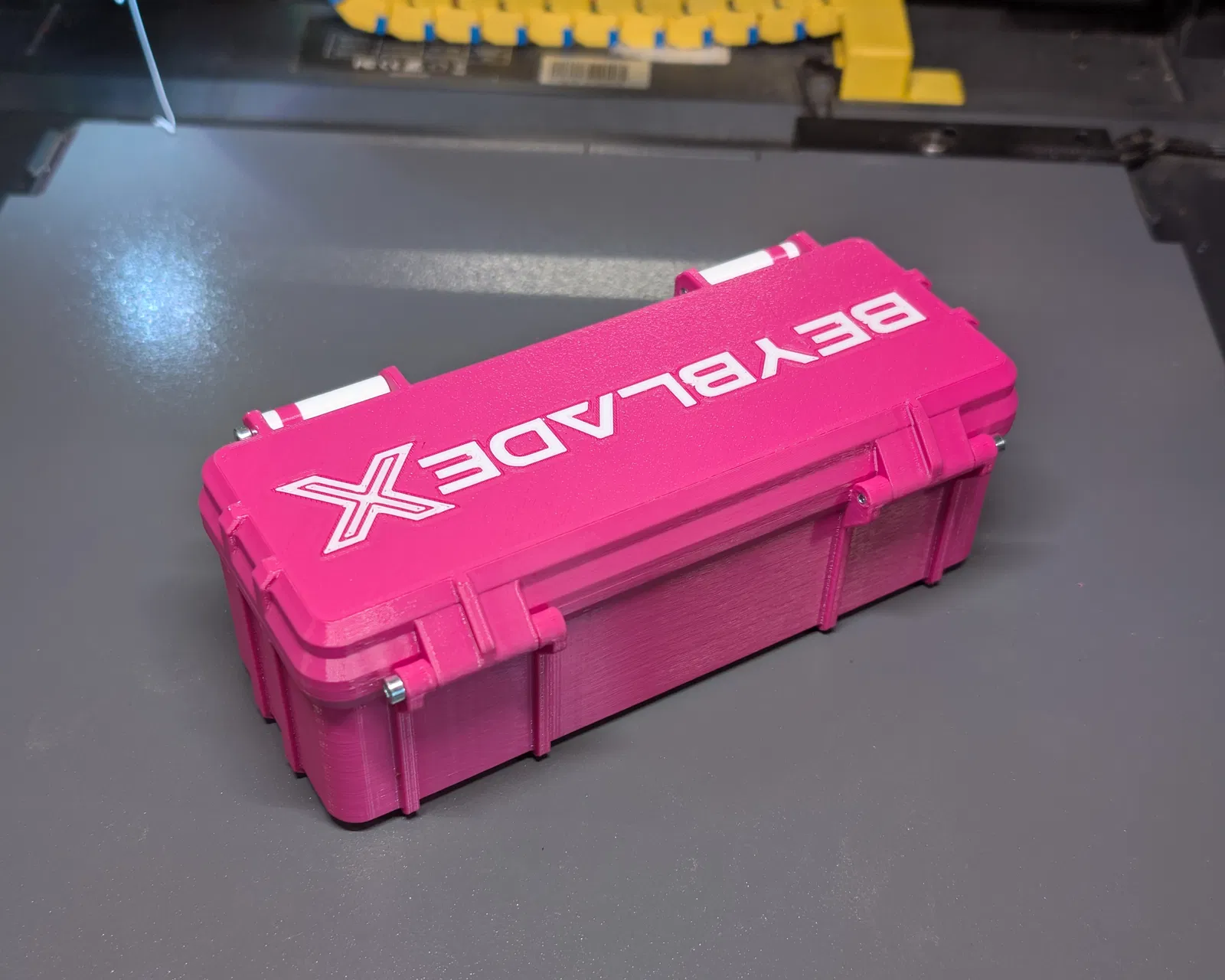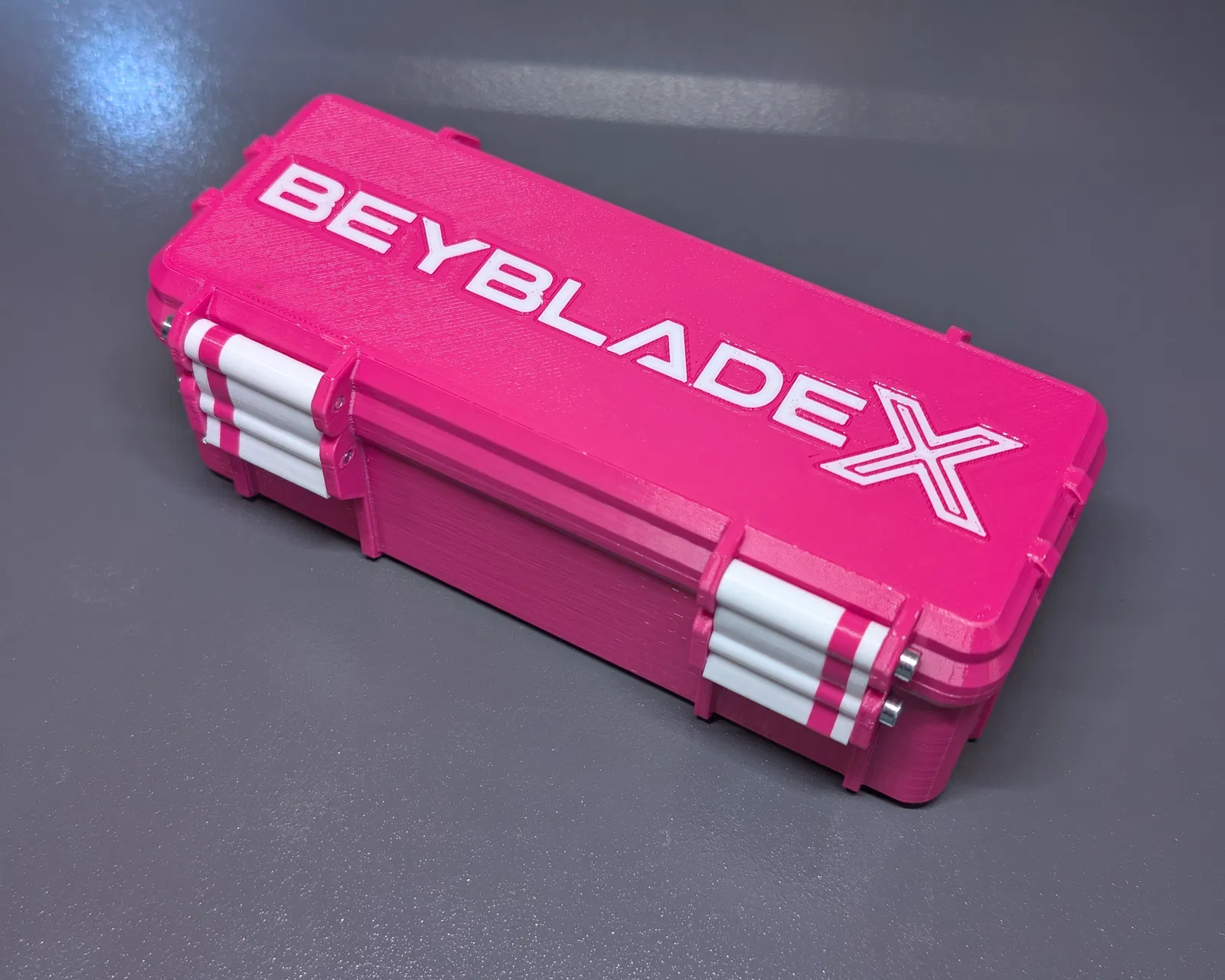 Hộp giải đấu đơn giản cho 3 BeyBlade X, kích thước tối đa đường kính 52mm và cao 46mm. Đã test in PETG (3 walls, 4 lớp top/bottom, infill 10%), lẫy nên 6+ walls; bản lề dùng đoạn filament.