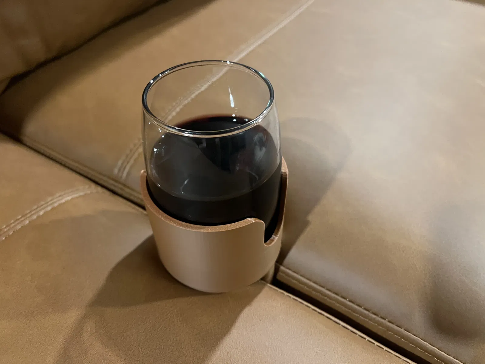 Giá đỡ ly/cốc kẹp giữa hai đệm ghế sofa, dùng cho cốc cà phê tiêu chuẩn hoặc ly vang không chân. Có thể scale để vừa cốc lớn hơn; tác giả gợi ý tăng lên 123% cho cốc lớn và chén snack nhỏ.