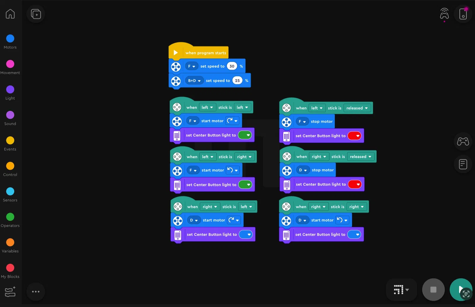 Đảm bảo drive motor (large motor) cắm vào port F và small motor cắm vào port D