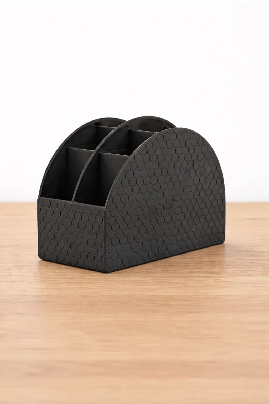 Bản remix khay để remote “Desk Organizer Remote Holder | Hex Edition” với họa tiết lục giác phủ mặt trước và hai bên, nhìn hiện đại và kỹ thuật hơn. Vẫn giữ kích thước/công năng, in đẹp với matte black, carbon-style, dual color silk; không cần support.