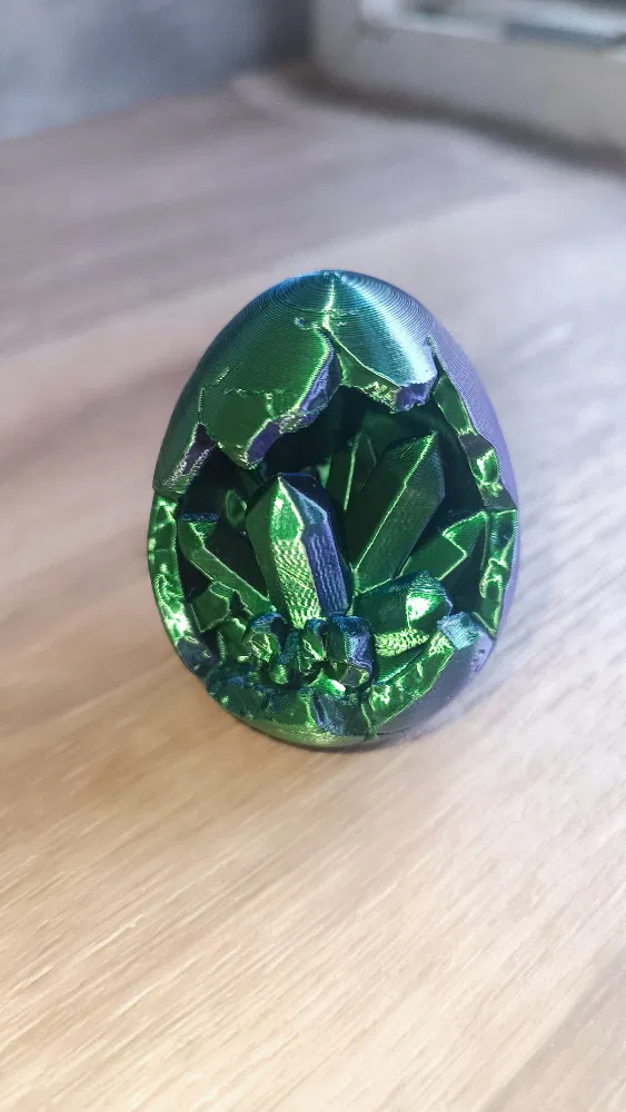 Trứng Phục Sinh kiểu “open geode” với phần rỗng bên trong đầy cụm tinh thể sắc nét, bắt sáng cực đã. Tối ưu cho Silk Dual-Color/Multicolor PLA, khuyến nghị Tree Supports, layer 0.16–0.2mm và 3 wall loops.