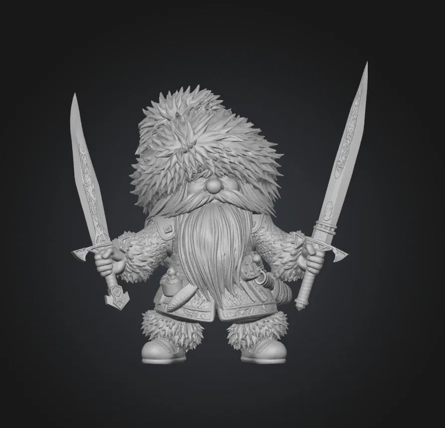 Mô hình "Twinblades of the Dwarf" này là một tác phẩm điêu khắc độc đáo, tái hiện hình ảnh một chiến binh người lùn với bộ trang phục dày ấm áp, nổi bật là chiếc mũ lông to sụ và bộ râu dài ấn tượng. Điểm nhấn chính của mô hình chính là cặp song kiếm mà chiến binh này đang nắm giữ, mỗi thanh kiếm đều được chạm khắc hoa văn tinh xảo, toát lên vẻ mạnh mẽ và uy dũng.