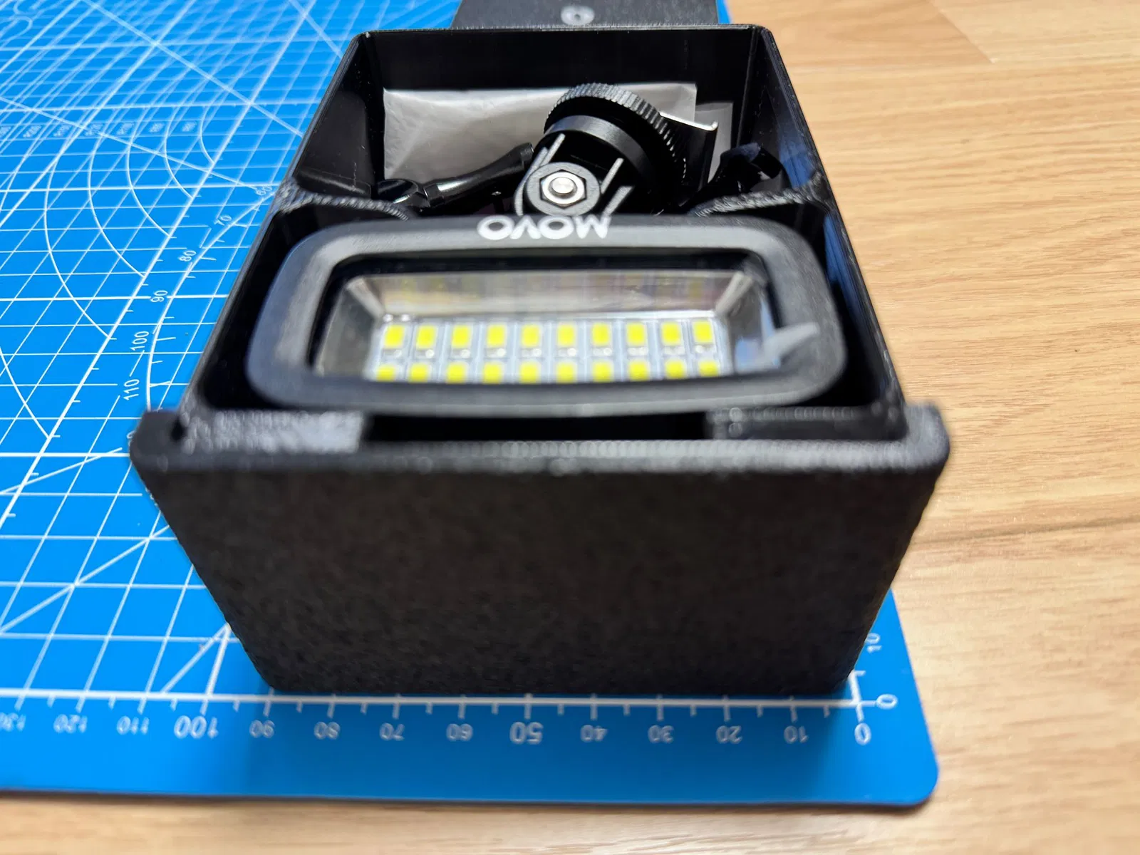 Hộp đựng được thiết kế với hai phần chính: phần đế giữ đèn và phần nắp đậy. Phần đế ôm sát đèn MOVO, giữ cho đèn không bị lung lay hay rơi rớt trong quá trình di chuyển. Bên trong có thêm các khay nhỏ để bạn có thể cất giữ các phụ kiện đi kèm như dây sạc, ngàm gắn... Một điểm cộng lớn là phần nắp đậy, không chỉ giúp bảo vệ đèn khỏi bụi bẩn, nước (tuy nhiên, cần lưu ý đây là hộp đựng chứ không phải vỏ chống nước hoàn toàn cho đèn), mà còn giúp tổng thể trông gọn gàng và chuyên nghiệp hơn. Thiết kế này rất phù hợp cho những ai muốn bảo quản thiết bị của mình một cách tốt nhất.