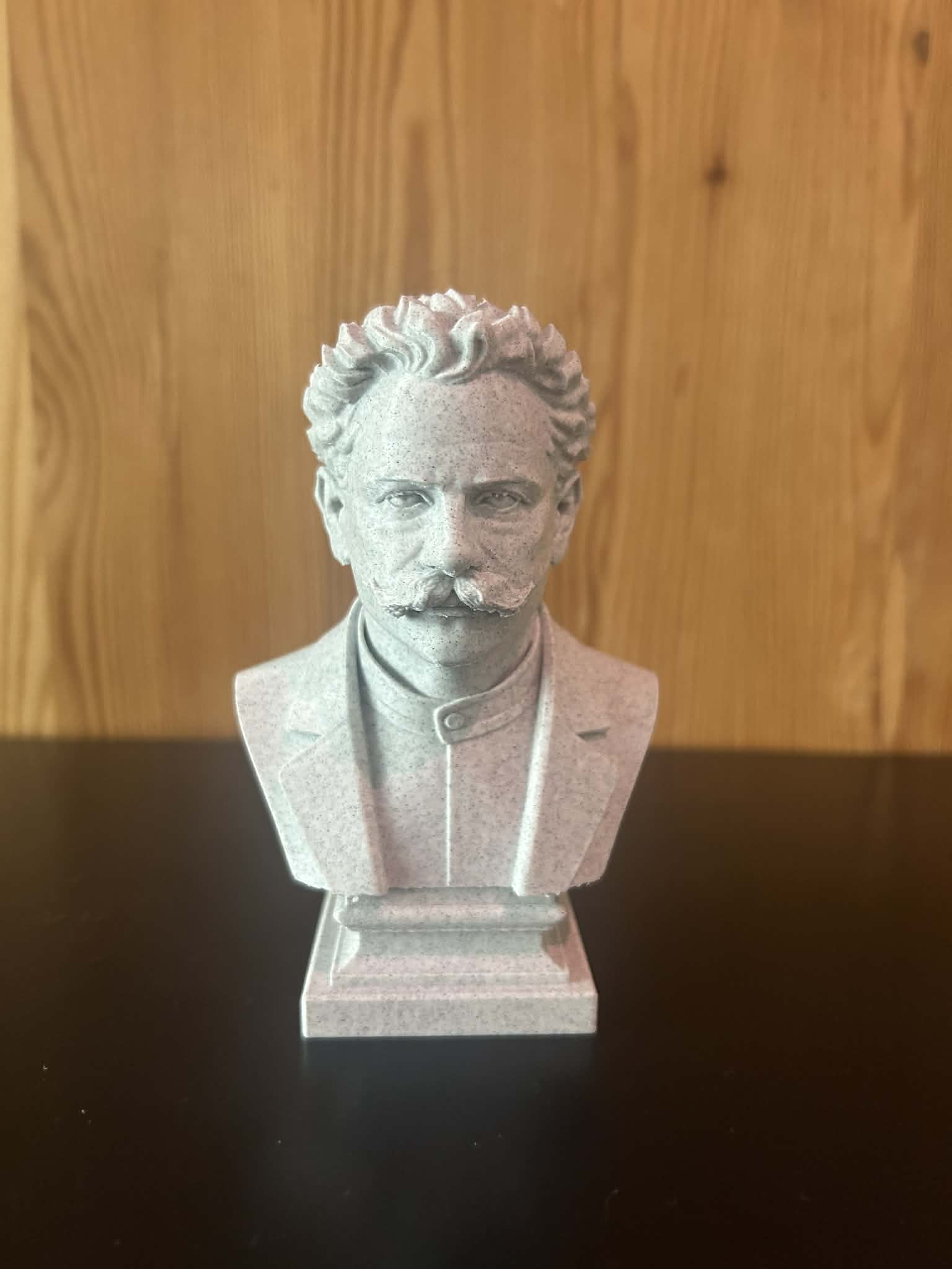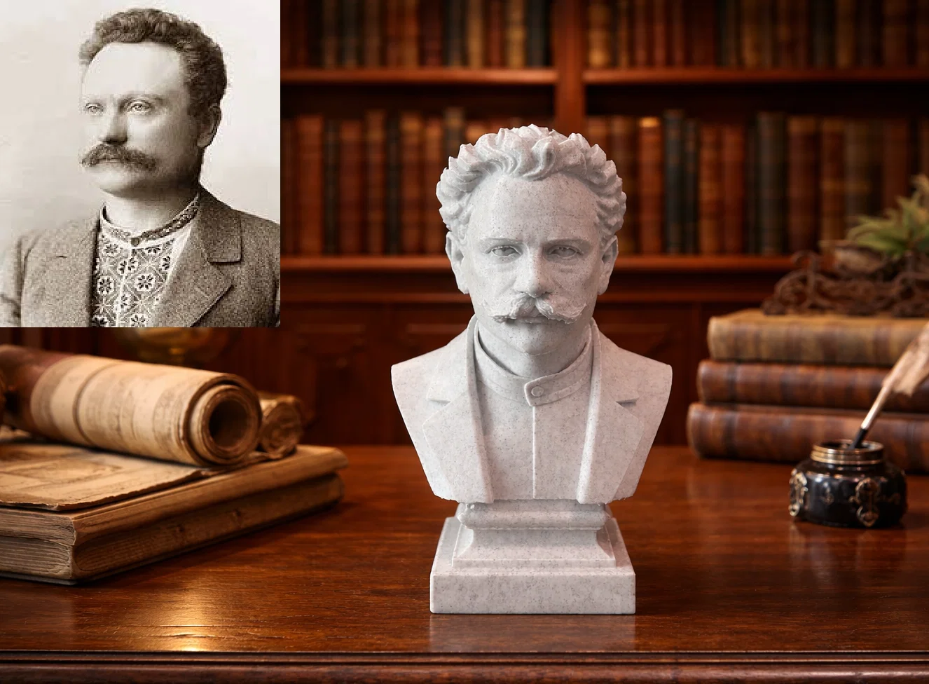 Mẫu 3D tượng bán thân Ivan Iakovytch Franko theo phong cách cổ điển, tập trung phần đầu và nửa trên thân trên bệ đỡ gọn. Khối mặt, trán rộng và ria mép được nhấn mạnh, giữ đúng tỉ lệ và nét trầm tư từ ảnh gốc.