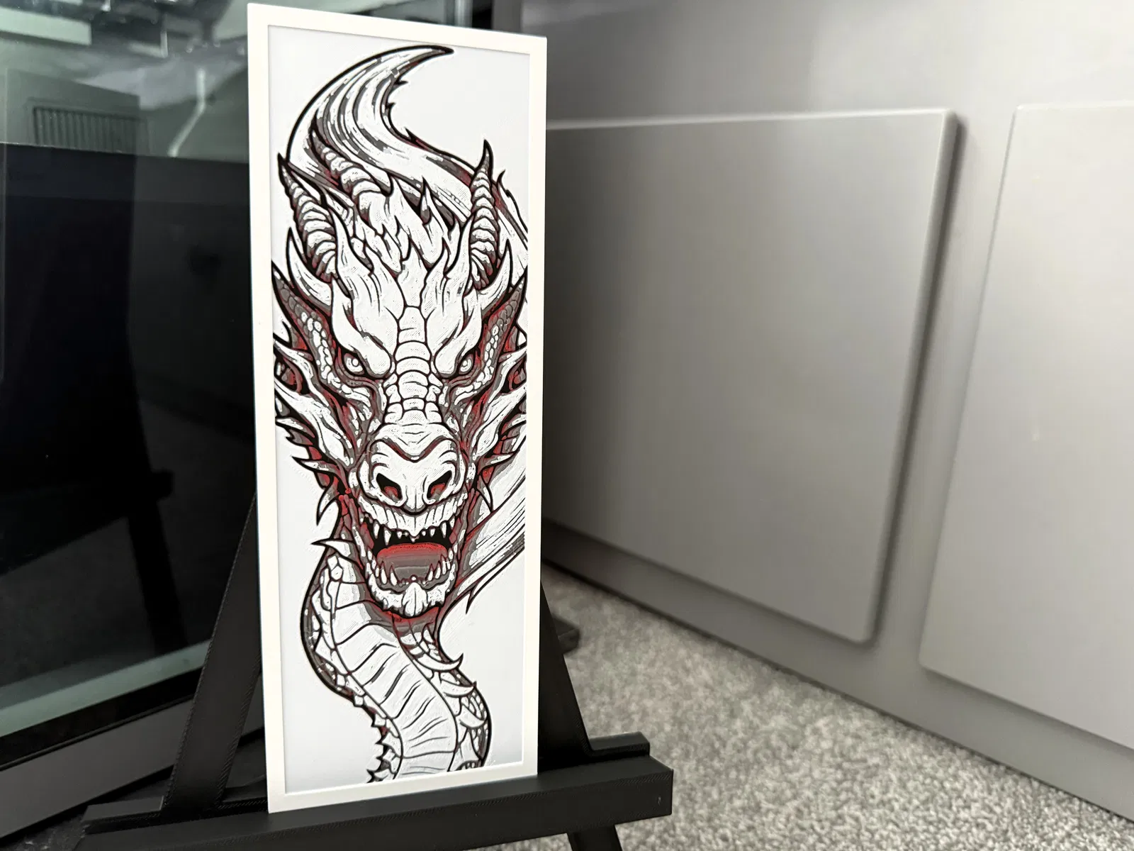 Mang sức mạnh của rồng lên tường nhà bạn với bức “filament painting” phong cách tương phản cao này. Thiết kế bằng Hueforge, bản in bắt trọn từng chi tiết gầm gừ của rồng với tông trắng trên nền đen cực nổi, điểm nhấn đỏ crimson sâu. Rất hợp cho fan fantasy, traditional tattoo art, hoặc ai muốn khoe khả năng của máy in Bambu với vài lần đổi filament đơn giản.