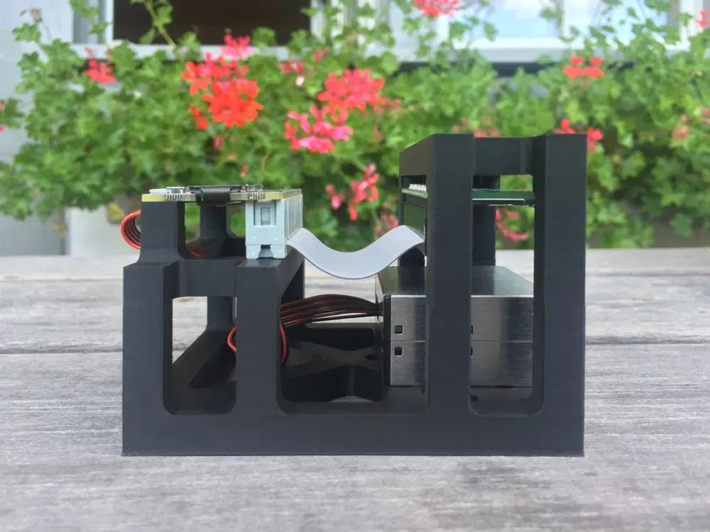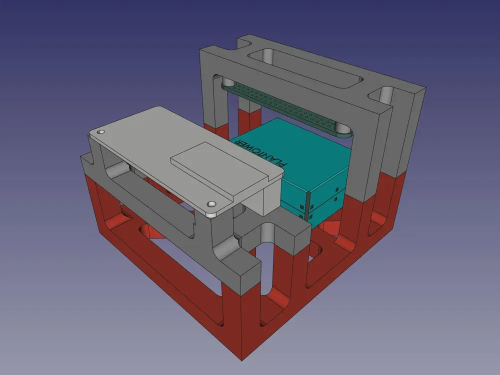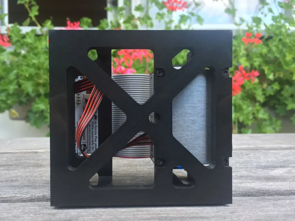 Các cảm biến trên Enviro+ rất nhạy. Thiết kế mặc định, nơi bảng cảm biến được đặt trực tiếp trên Raspberry Pi (Zero) không phải là tốt. Nhiệt từ CPU của RPi có ảnh hưởng lớn đến cảm biến nhiệt độ BME280. Để khắc phục điều này, tôi đã thiết kế một khung để gắn Raspberry Pi Zero, Enviro+ và PMS5003, nơi các chân GPIO được kết nối bằng cáp băng.