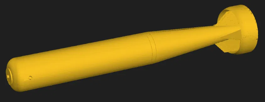 Mô hình Mark 8 Nuclear Bunker buster (bom hạt nhân Mỹ đời đầu), phục vụ giai đoạn 1952–1957. Dựng theo kích thước Wikipedia và ảnh bảo tàng; bản in 1:24 dài khoảng 5 inch, dự kiến sẽ bổ sung mounting hooks và biến thể mũi tròn.