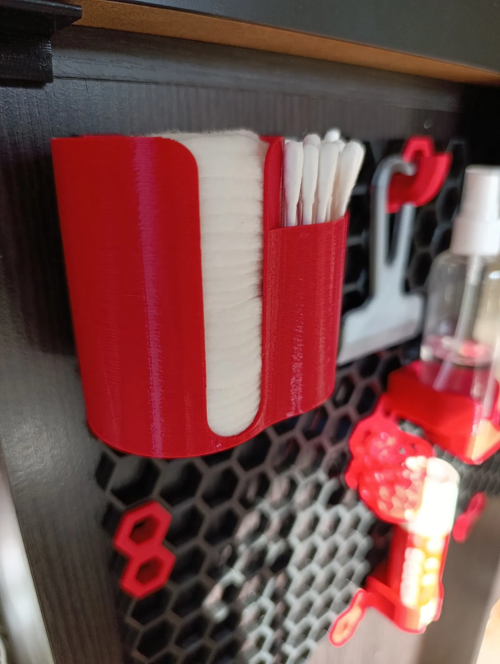 Držák/organizer đựng bông tẩy trang (cotton pad) và tăm bông (qtip) gắn trực tiếp lên HSW. Phần ngàm lớn khớp thẳng vào honeycomb, không cần in thêm chi tiết nào. Dễ in, không cần support.