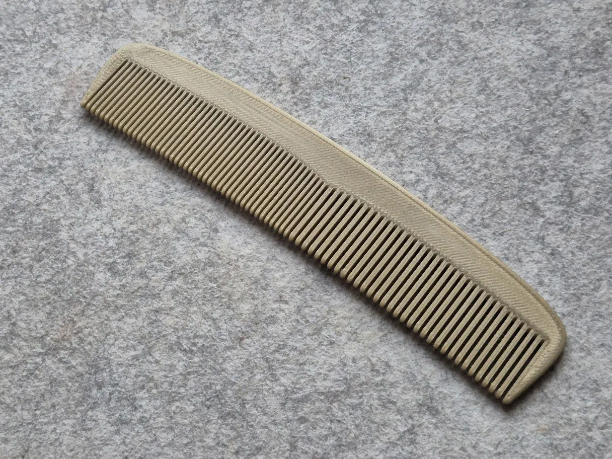 Pocket Comb kiểu cổ điển với 2 vùng mật độ răng: một bên răng thưa, dày cho tóc dày/tóc ướt; bên còn lại răng mịn, sát cho tóc khô và tạo kiểu. Kích thước 146 × 33 × 3 mm, tối ưu để in 3D.