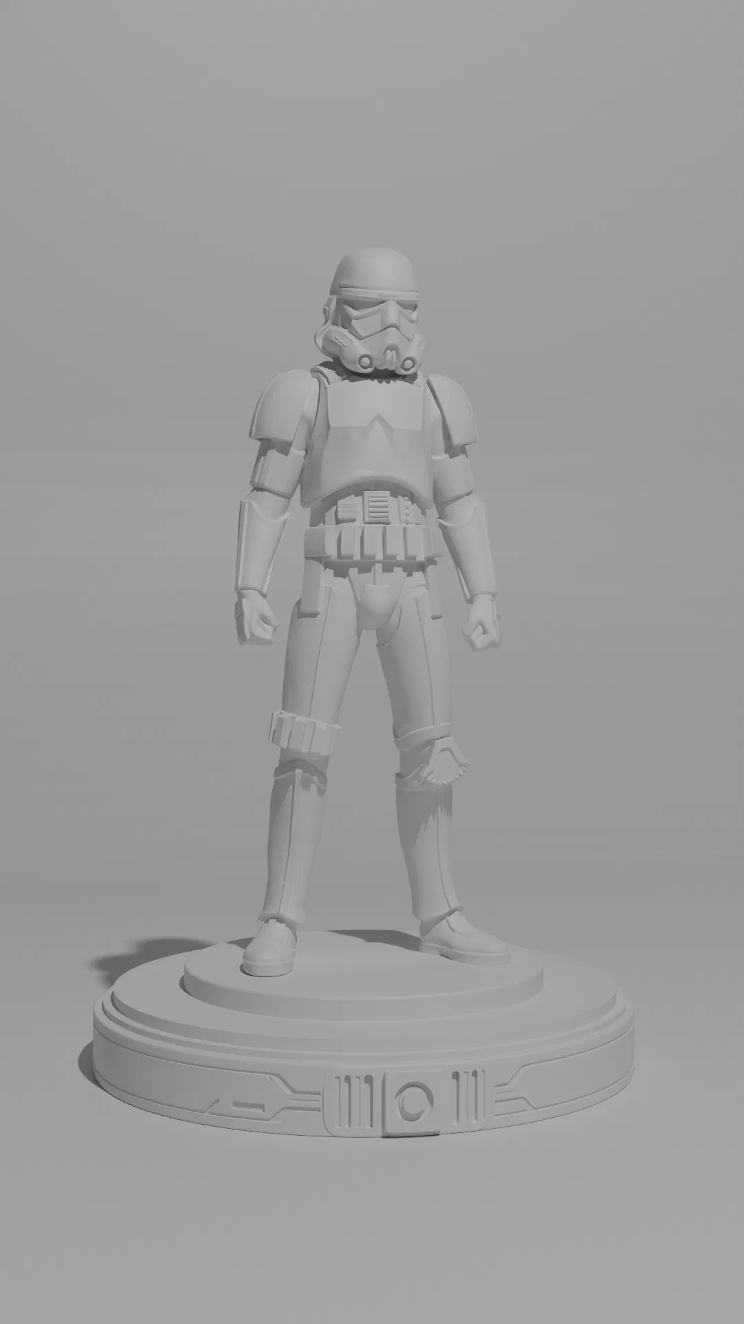 Đây là một mô hình 3D Stormtrooper Đế Chế. Nhân vật đứng trên một bệ tròn có chi tiết, khoe bộ giáp kinh điển với bề mặt sạch, không có texture, nhờ vậy làm nổi bật rõ các khối, đường nét và vùng đổ bóng.