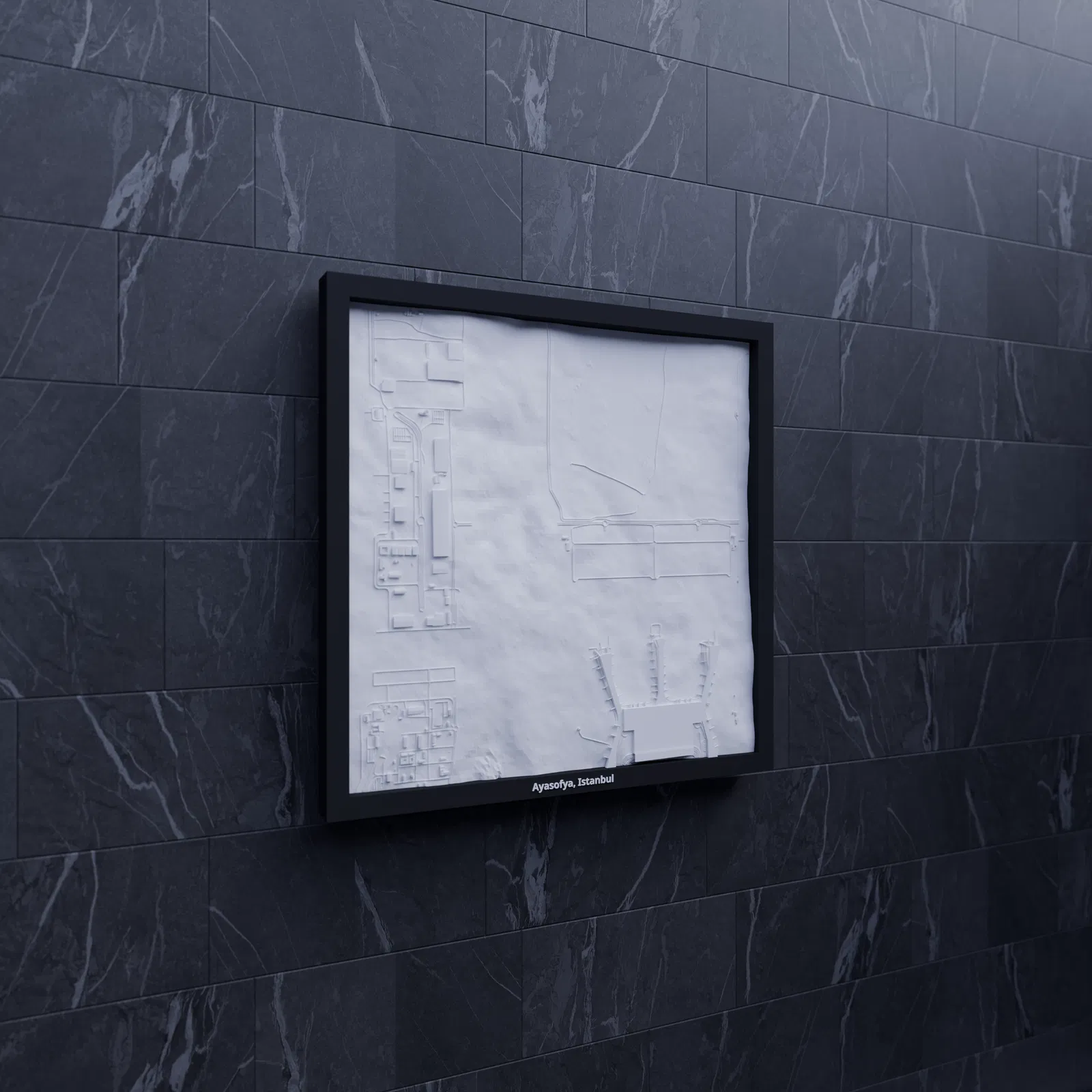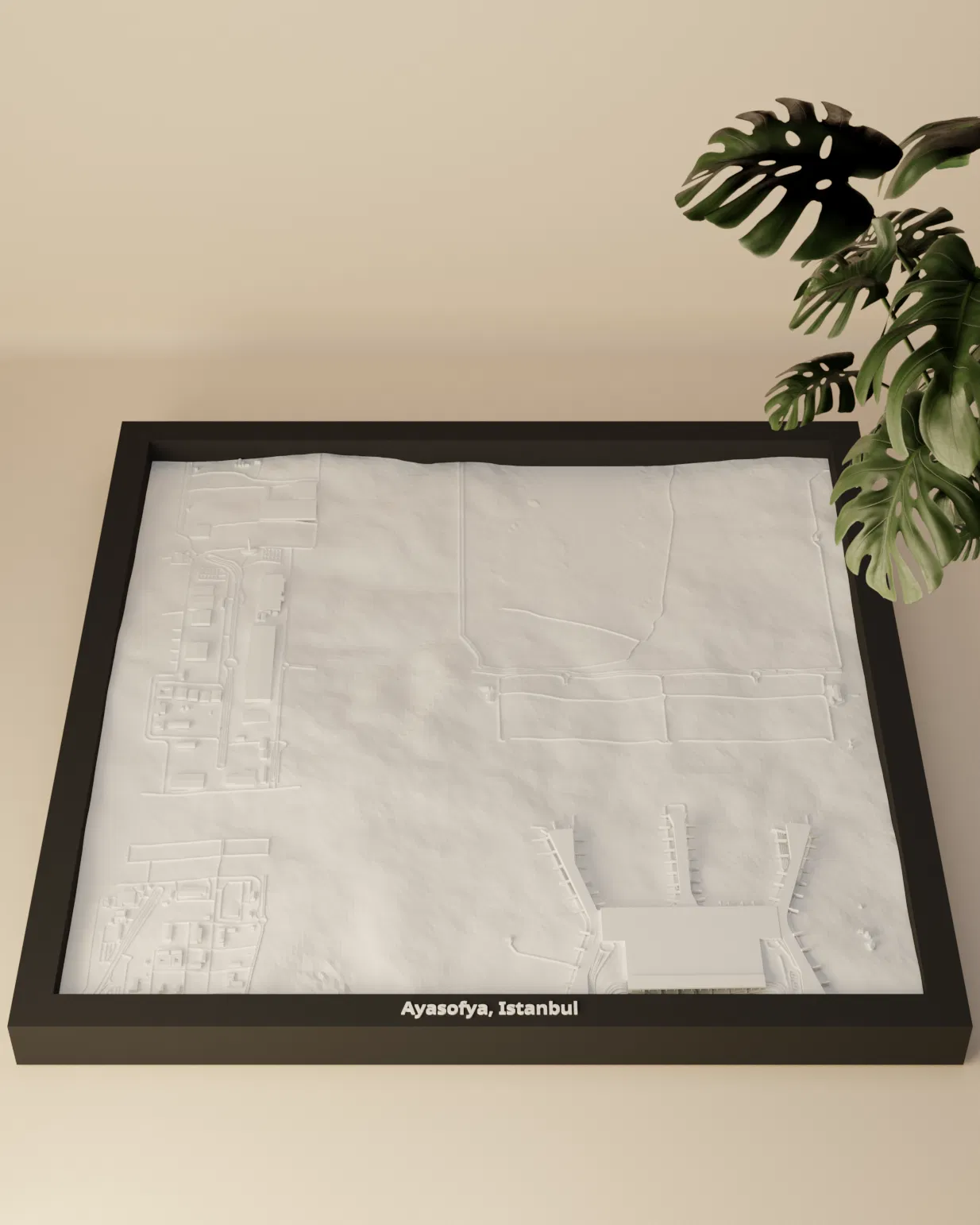 Mô hình địa hình thu nhỏ Ayasofya (Istanbul, Thổ Nhĩ Kỳ) dựng từ dữ liệu địa lý, thu nhỏ khu vực 3.636 x 3.621 km xuống 220 x 220 mm. Có sẵn STL/3MF và nhiều lựa chọn frame kèm lỗ treo, profile in tối ưu.