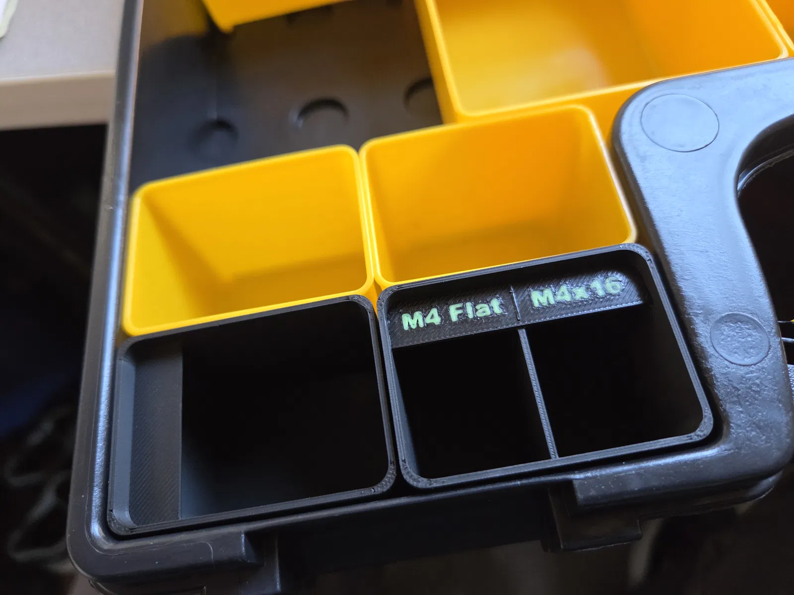 Bộ insert nhãn in được cho hộp Harbor Freight, thiết kế bấm khớp lên kệ hiện có. Đã chỉnh sửa để bù chênh lệch chiều cao chân, giúp nắp bấm khép kín. Khuyên in nhãn với nozzle 0.2mm.