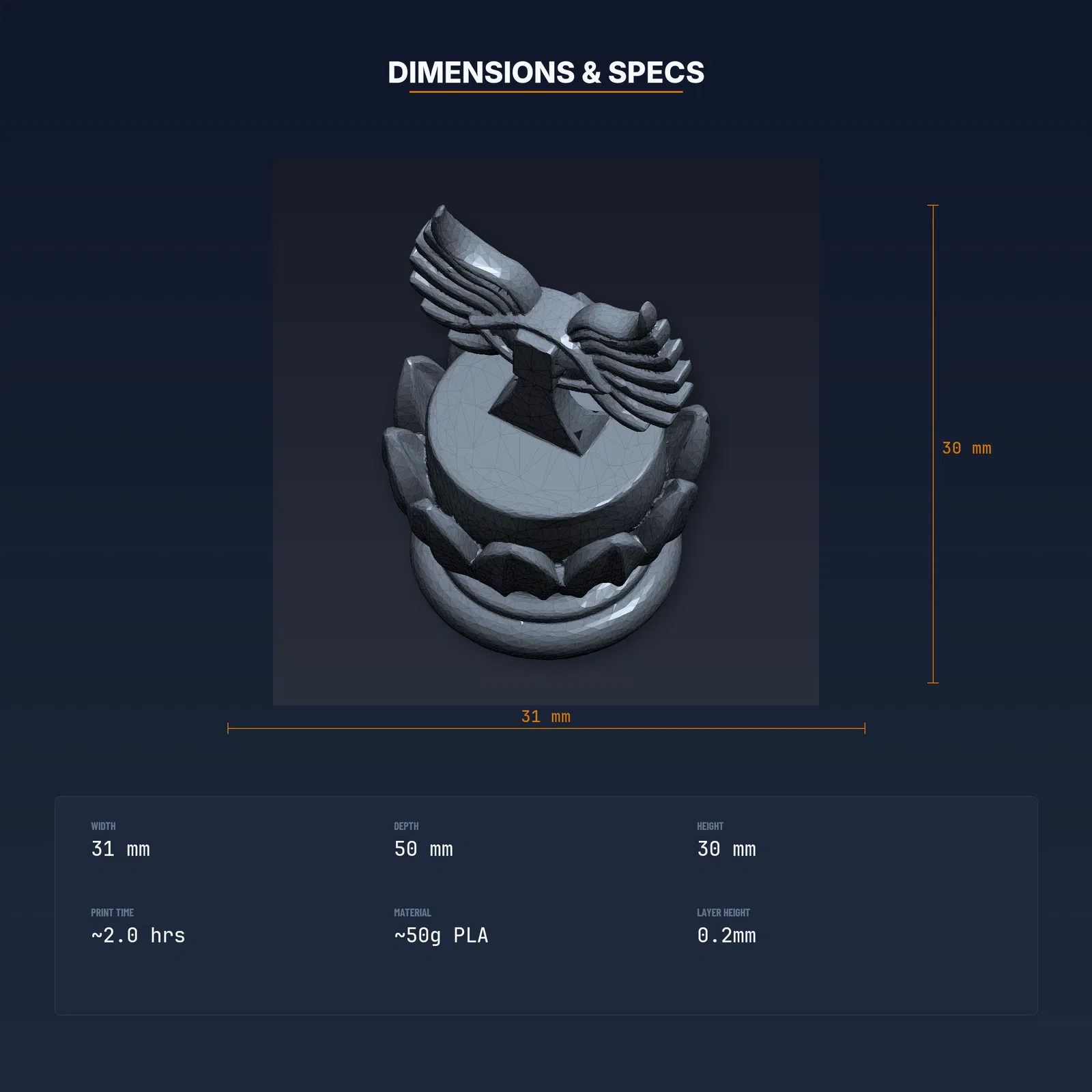 Mẫu kệ trưng bày Eye Of Horus 3D printable, tải về in liền. Có sẵn STL/3MF/OBJ và print guide thông số đã test trên nhiều máy FDM. Kích thước 31.2×50.0×30.3 mm; khuyến nghị PLA.