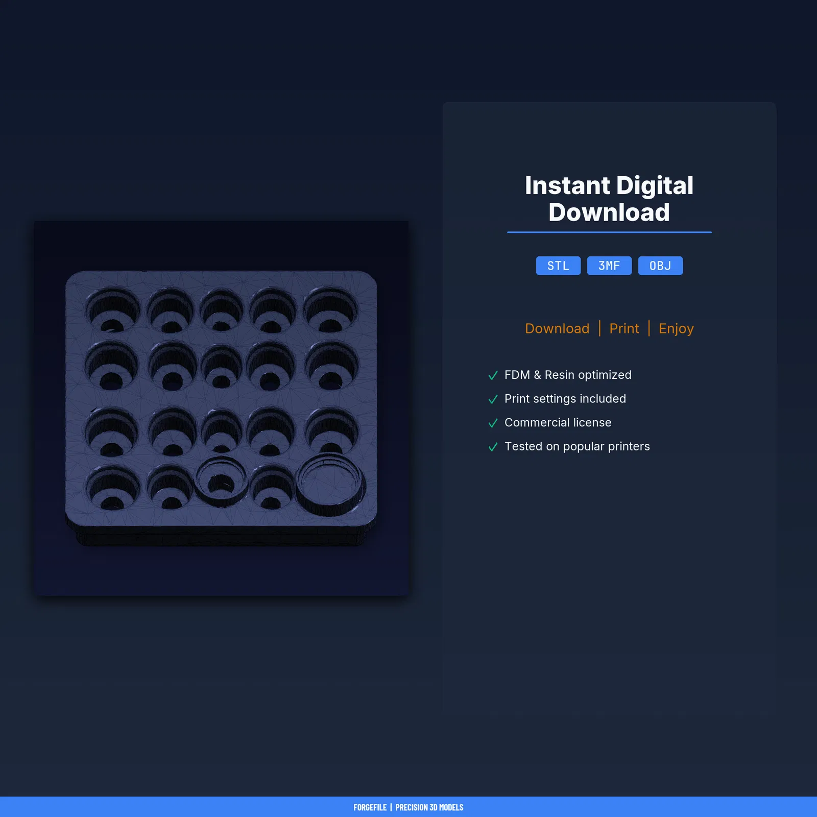 Khay foam insert dành cho hộp đựng eyepiece kính thiên văn, chia ngăn tùy biến. Có file STL/3MF/OBJ và print guide. Đã test 8+ máy FDM, in nhanh ~1.5 giờ, ~44g PLA. Kèm license thương mại.