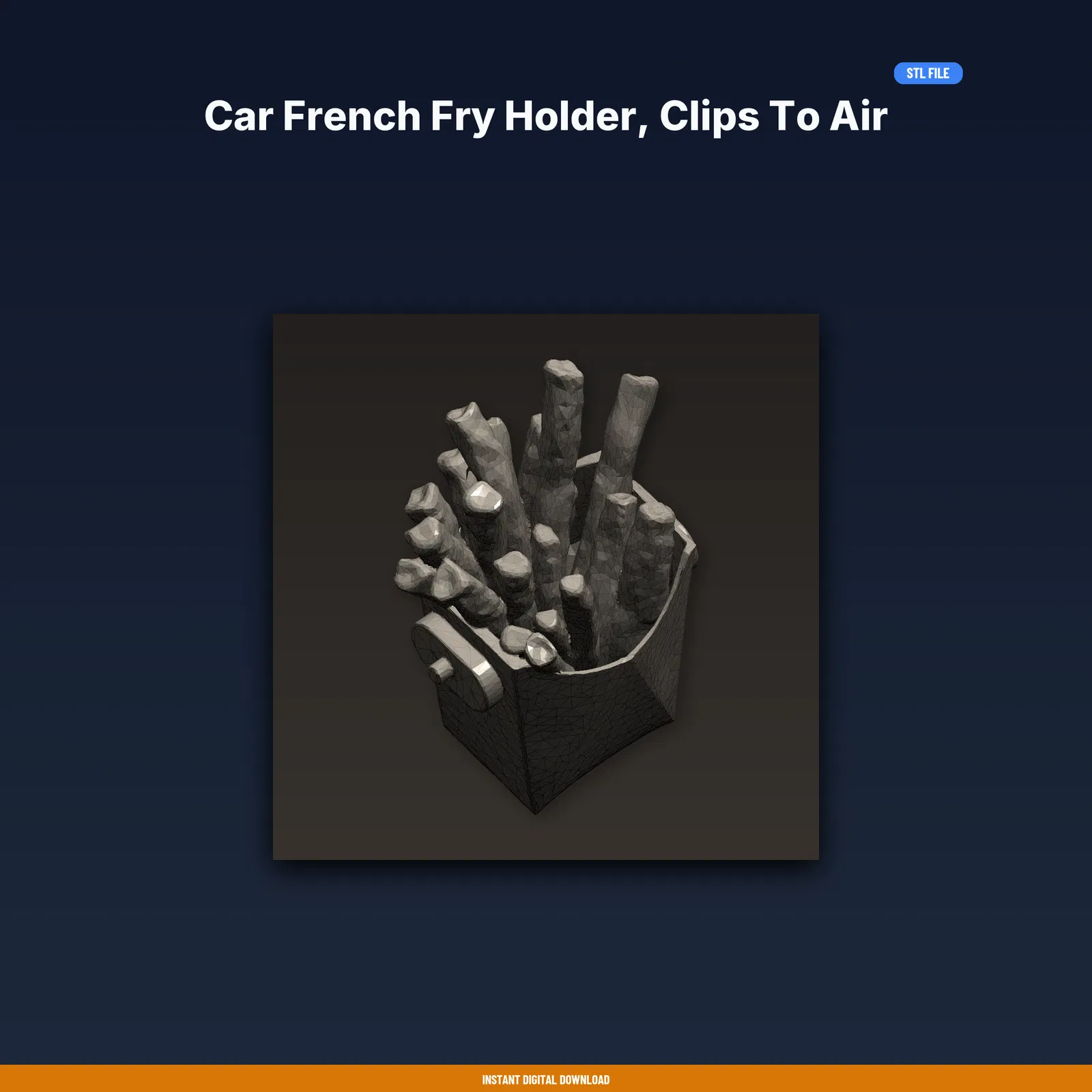 Mẫu Car French Fry Holder kẹp vào khe gió điều hòa, giữ khoai tây chiên và hộp sốt gọn gàng khi đi drive-thru. Gồm STL/3MF/OBJ + print guide; đã test trên nhiều máy FDM, in ngay với PLA/PETG.