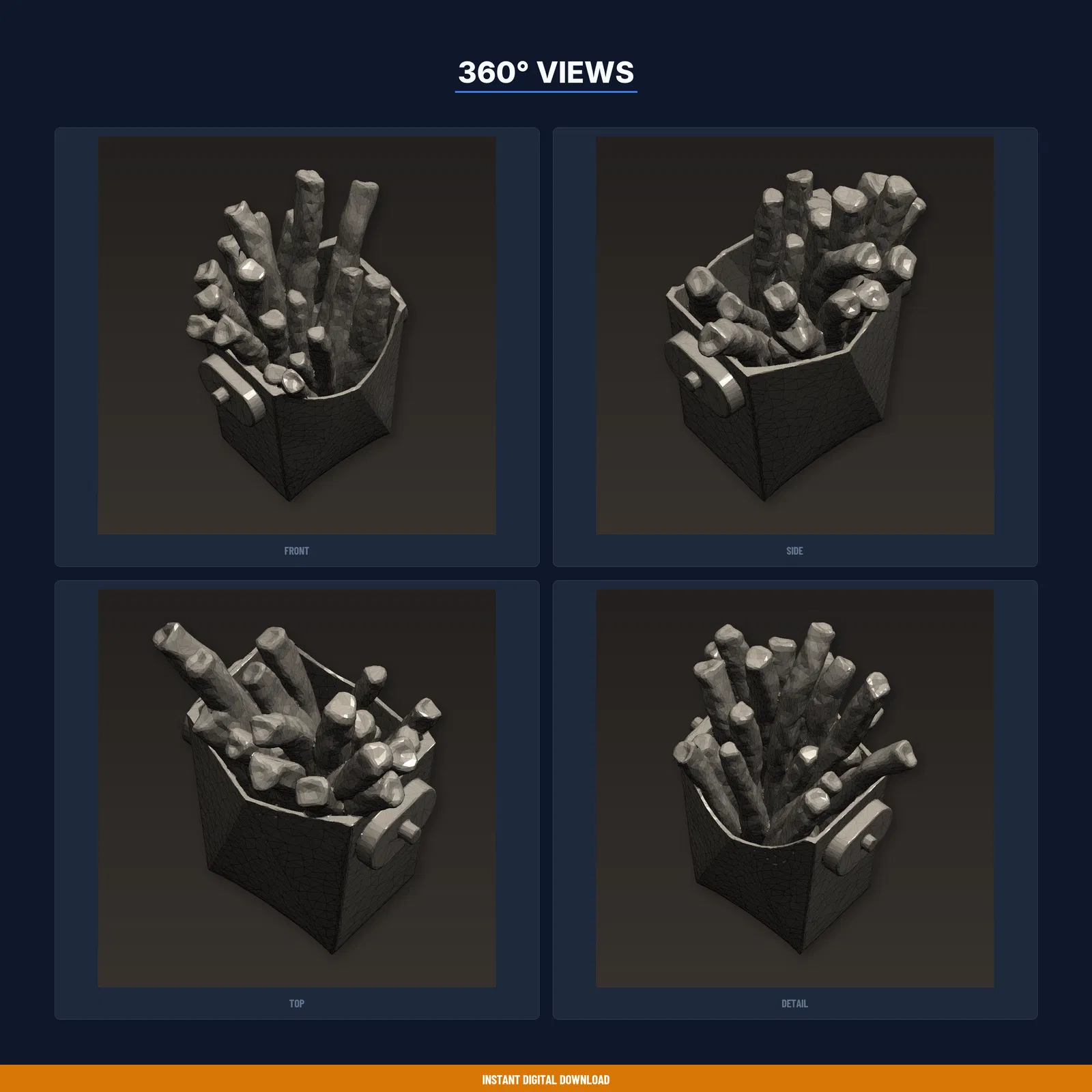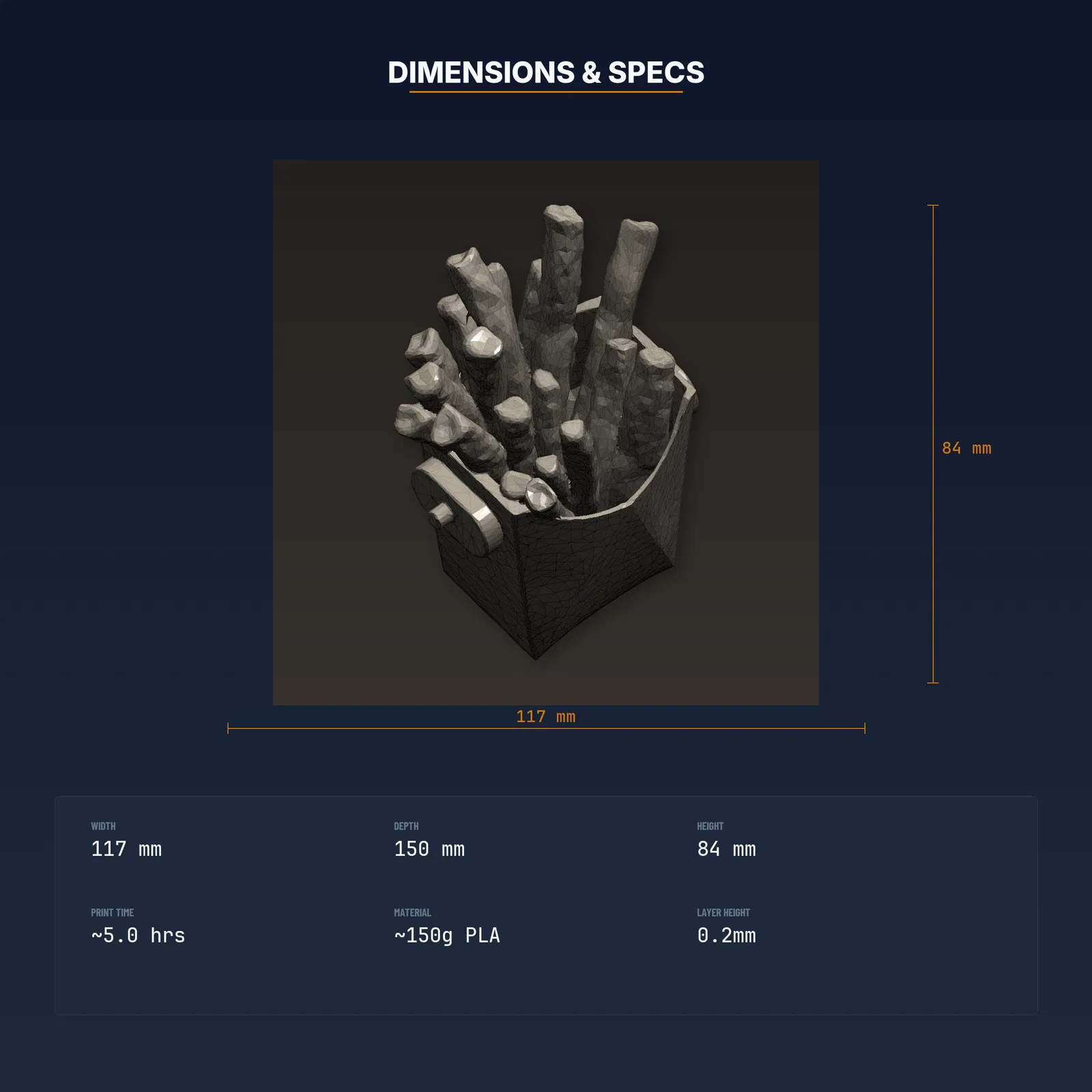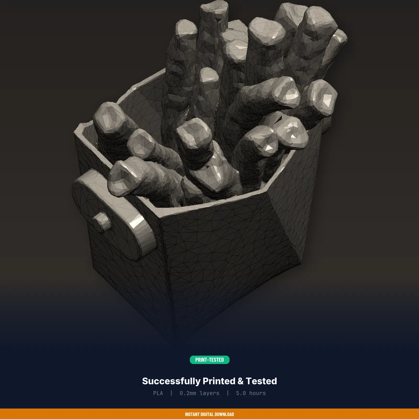 Khay đựng khoai tây chiên trên xe kẹp vào cửa gió điều hòa, kiêm khay để sốt fast food. Tải về in ngay, gồm STL/3MF/OBJ và hướng dẫn in đã test. Phù hợp FDM, khuyến nghị PLA (PETG cũng được).