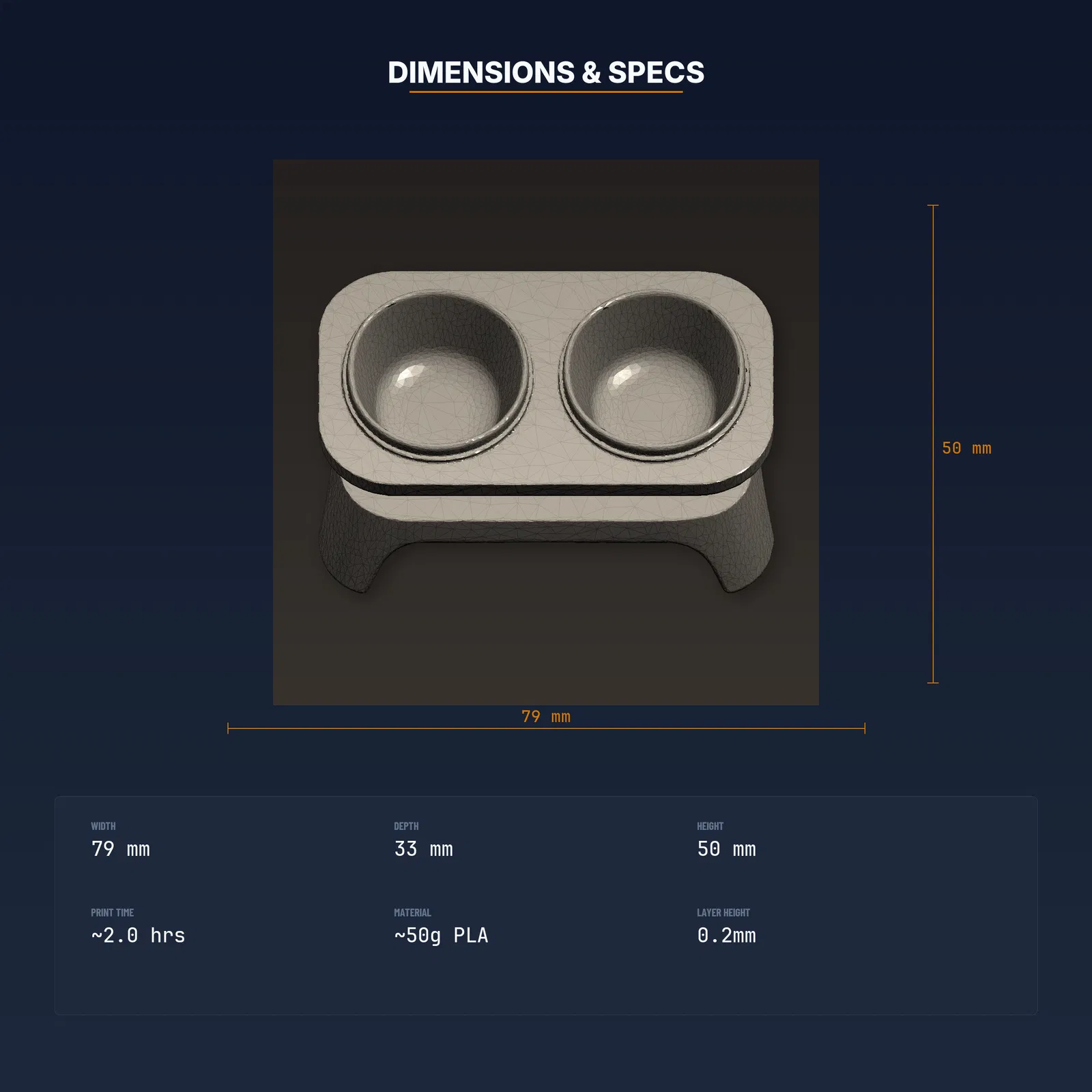 Chân đế nâng tô cho thú cưng có thể in 3D, đã thử nghiệm trên 8+ máy in FDM. Bộ file gồm STL/3MF/OBJ và print guide thông số đã test. Khuyến nghị in PLA (PETG cũng được), kích thước 79.3×33.3×50 mm.