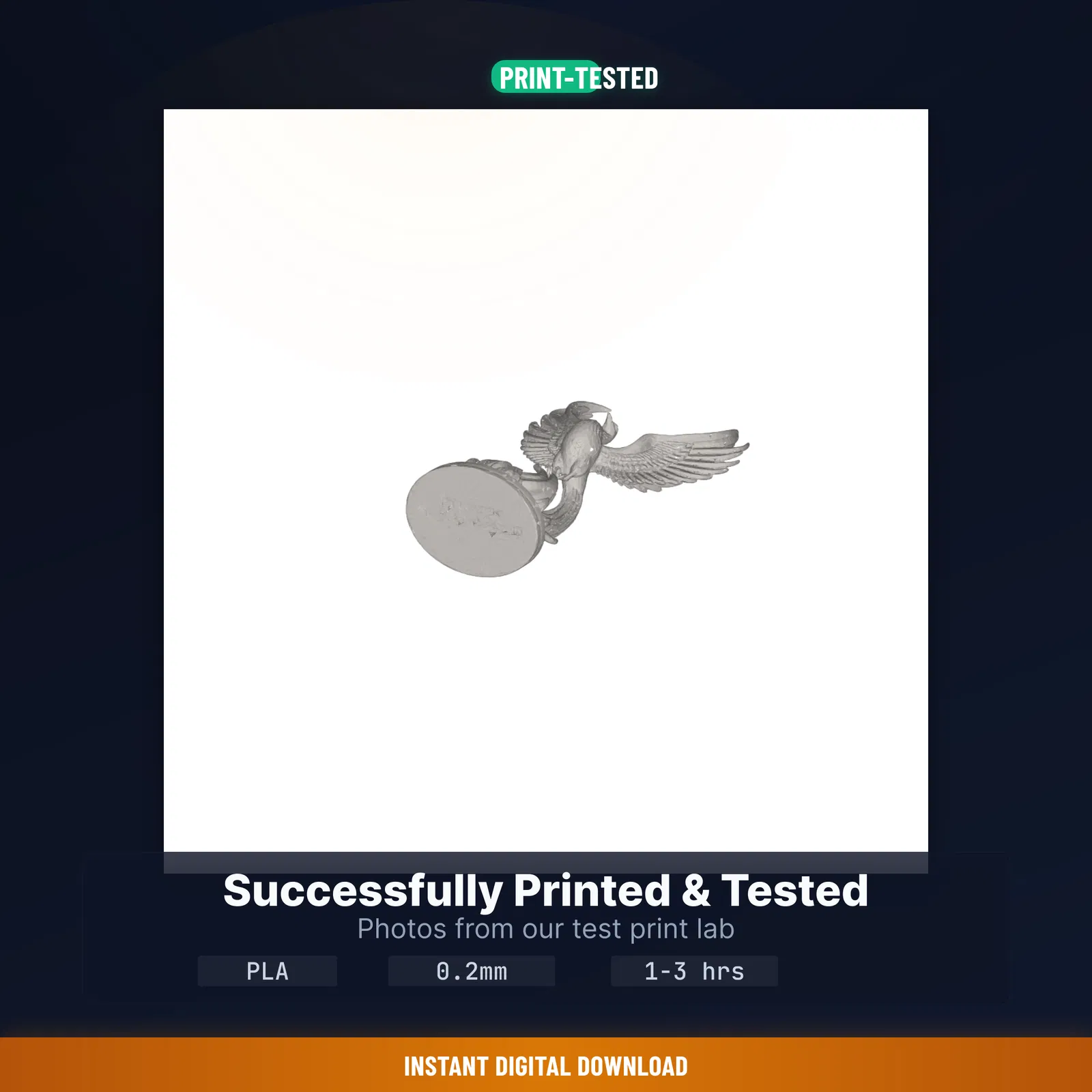 Mẫu Phoenix Rising From Flames 3D printable độc đáo, có sẵn STL/3MF/OBJ và print guide thông số đã test. Kích thước 59.8×100.0×36.7 mm, in ~1.8 giờ, tốn ~15g PLA. Có commercial license để in và bán bản in.