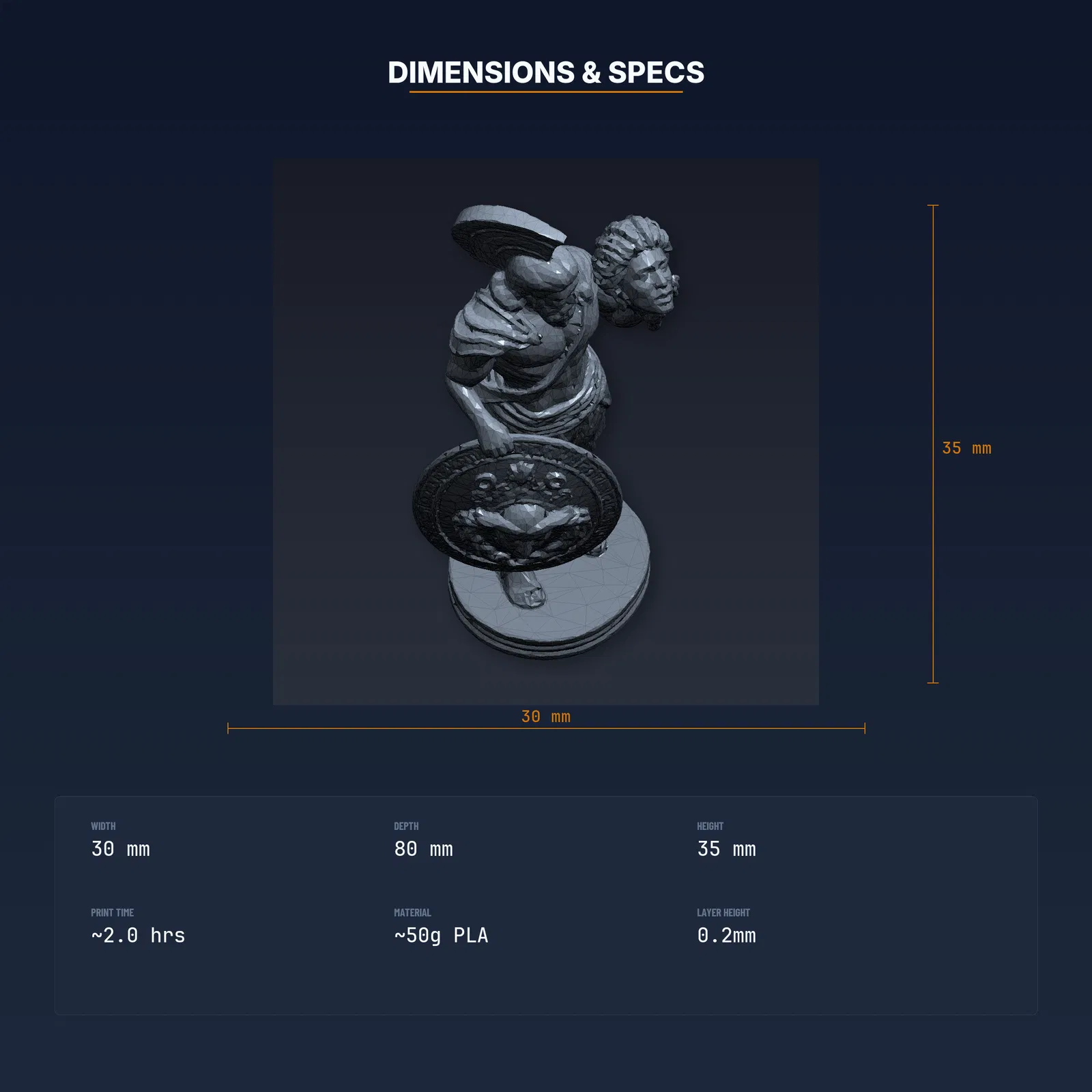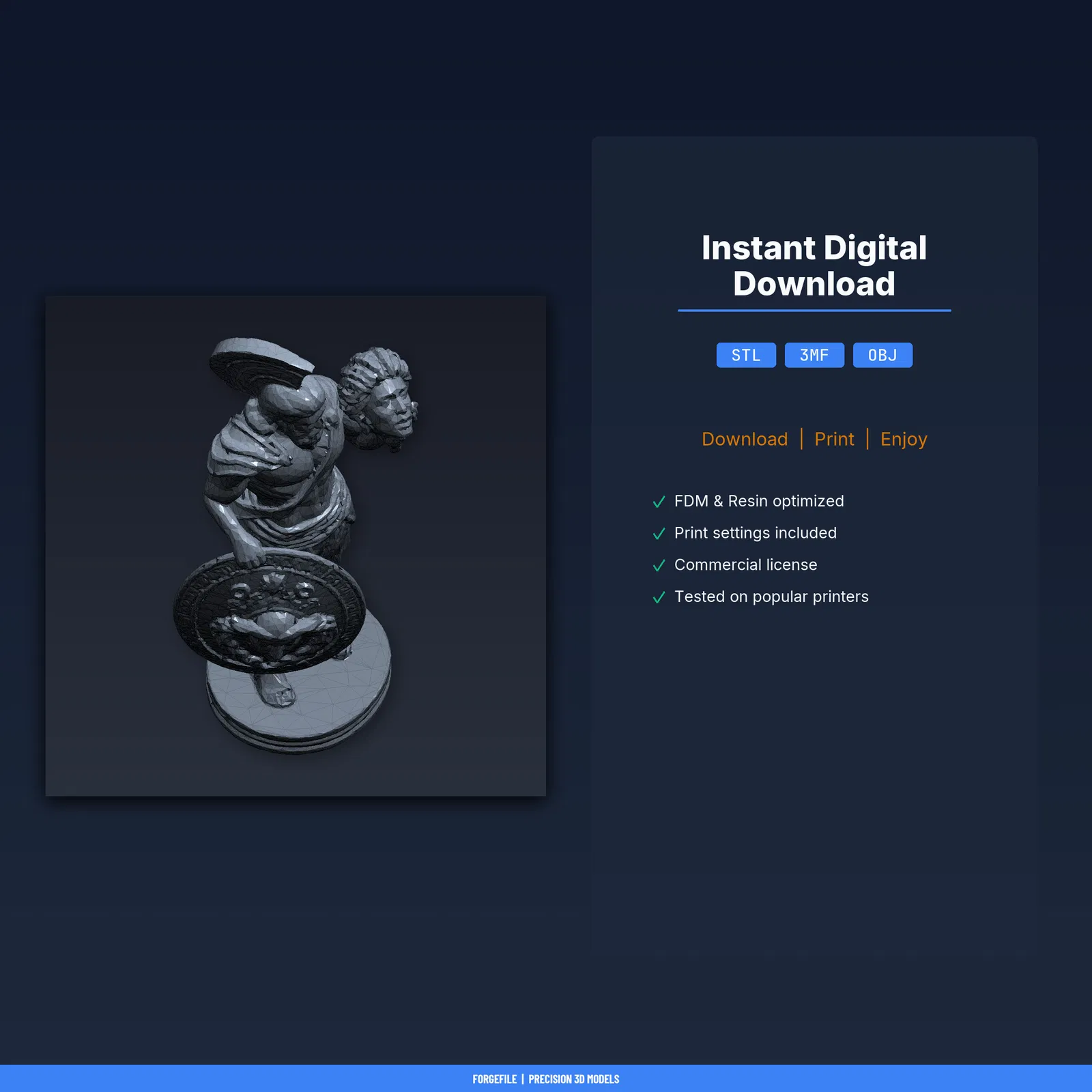 Mẫu Perseus cầm đầu Medusa dành cho in 3D, đã test trên 8+ máy FDM. Gói tải gồm STL/3MF/OBJ và hướng dẫn in kèm thông số. Kích thước 29.5×80.0×34.7 mm, khuyến nghị PLA.