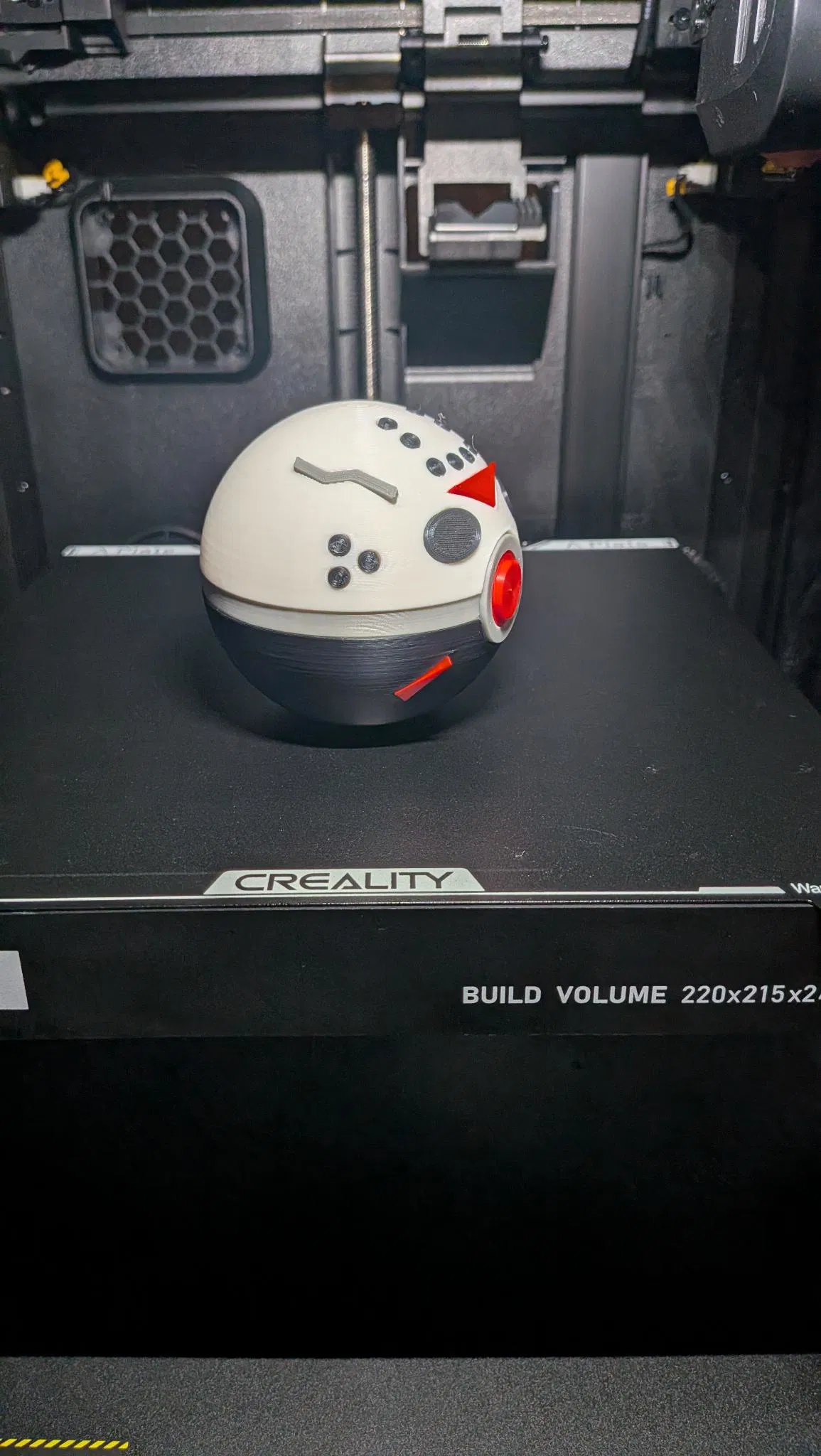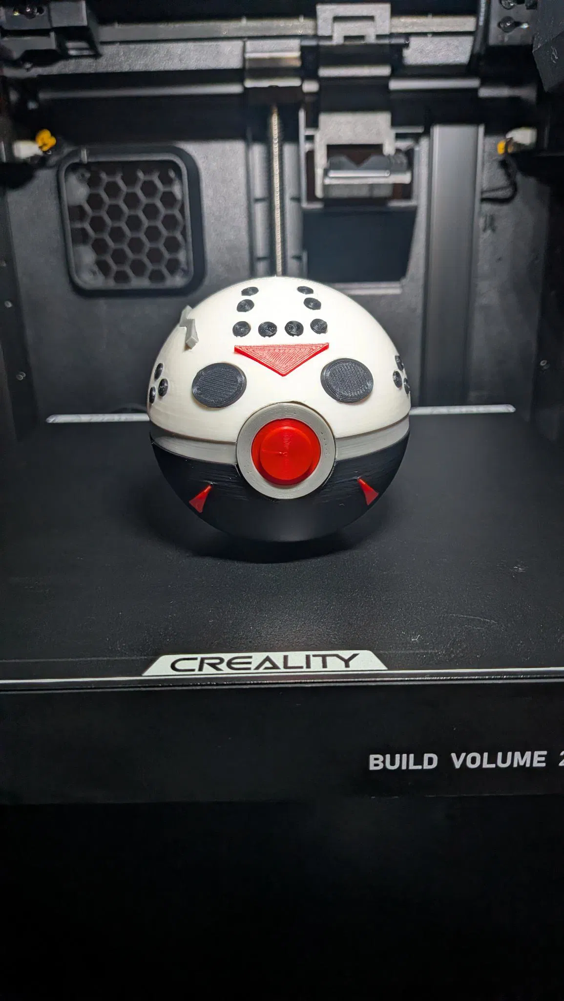 Slasher Sphere lấy cảm hứng từ Pokémon và Friday the 13th: Pokéball mang mặt nạ hockey của Jason Voorhees, có vết nứt rìu và vạch đỏ chevron. Thiết kế snapfit, in không cần supports.