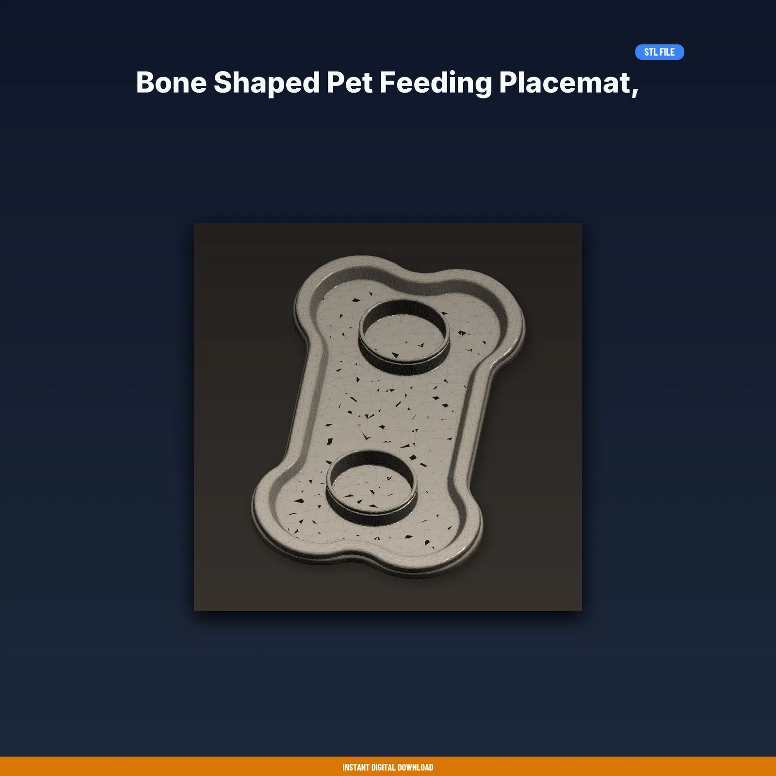 Tấm lót chỗ ăn thú cưng hình xương có viền nâng giữ nước/đồ ăn tràn, bề mặt chống trượt. Gồm STL/3MF/OBJ và hướng dẫn in. Đã test 8+ máy FDM, khuyến nghị PLA (PETG cũng được).