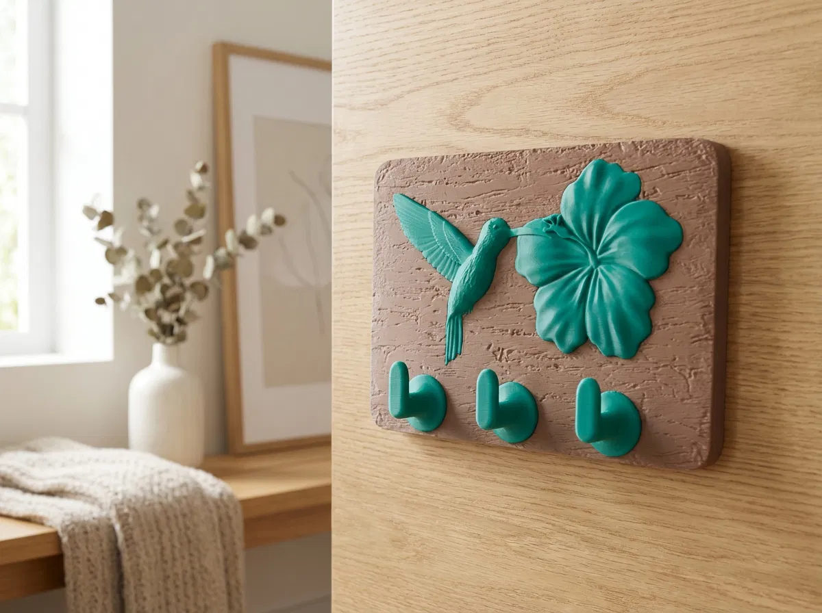 Thêm chút vibe nhiệt đới cho thói quen hằng ngày với Hummingbird & Hibiscus Key Holder — một giá móc treo gắn tường mà nhìn cũng đẹp mắt. Thiết kế có tấm nền giả “gỗ” dạng texture, hình chim ruồi đang bay được đắp nổi, kèm một bông dâm bụt nổi bật, hoàn thiện với 3 móc treo chắc chắn để treo chìa khóa, dây đeo (lanyard), dây dắt chó, khẩu trang hoặc túi nhẹ. In bằng nhựa 3D-printed bề mặt matte, phần nền vân gỗ tương phản với các chi tiết trơn, điêu khắc giúp tổng thể trông gọn gàng, hiện đại mà vẫn ấm và mang tính trang trí. Dùng hằng ngày rất ổn, nhưng nhìn như một món điêu khắc mini treo tường — hợp cho khu vực cửa ra vào, bếp, phòng studio, hay bất kỳ chỗ nào bạn hay với tay lấy đồ trước khi ra ngoài.