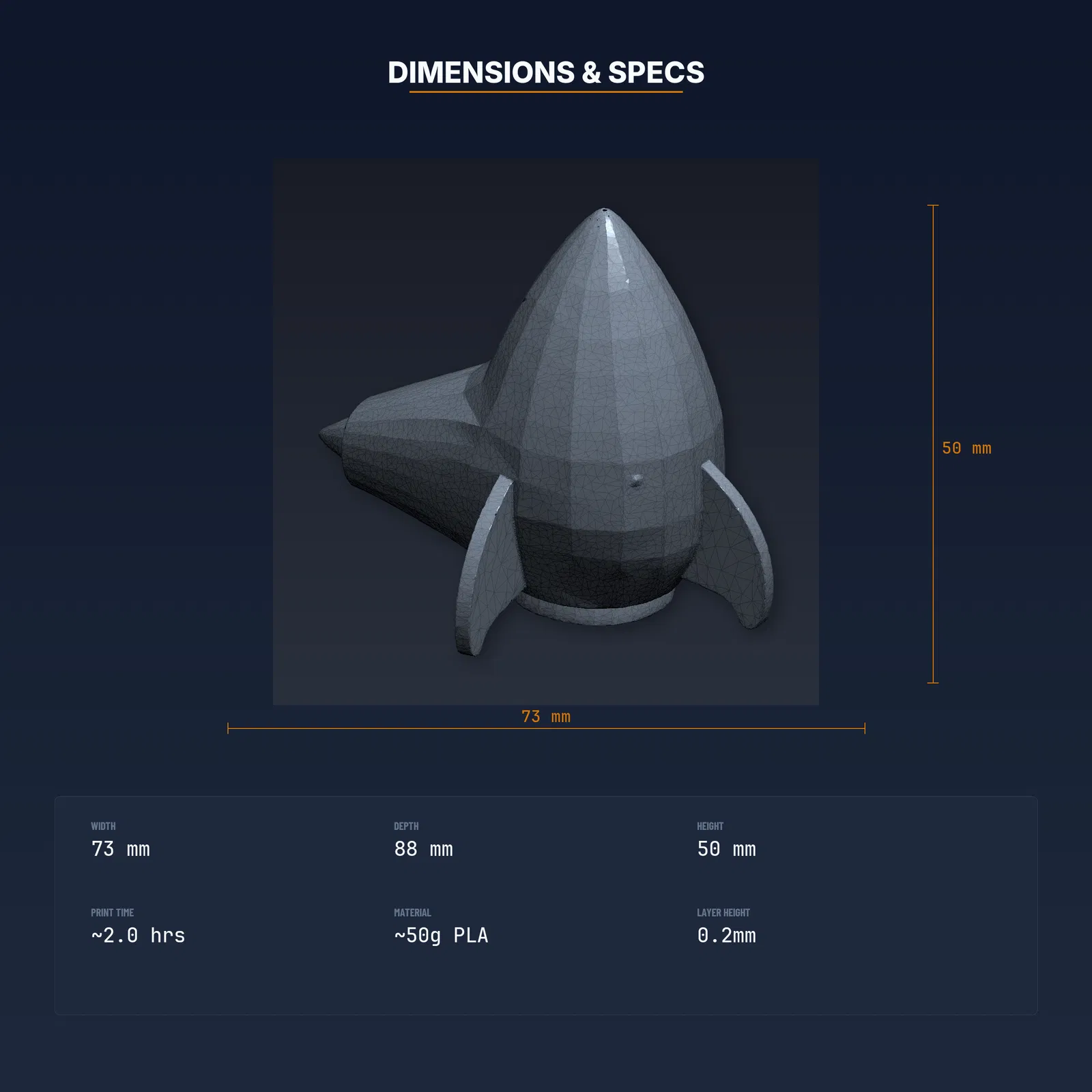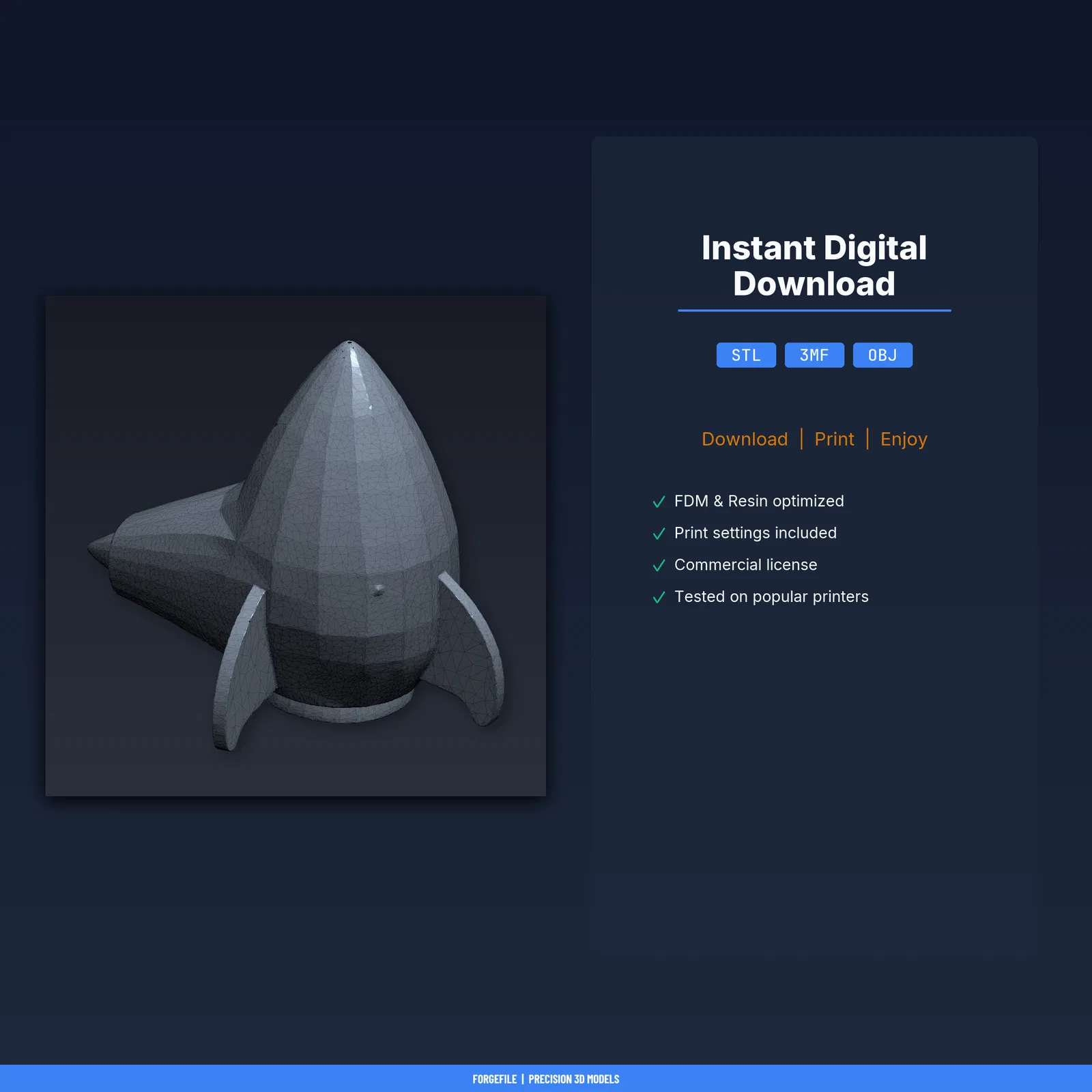 Mẫu Retro Rocket Desk Organizer để in 3D, đã test trên 8+ máy FDM. Gồm STL/3MF/OBJ và hướng dẫn in kèm setting. Kích thước 72.8×87.5×50mm, khuyến nghị PLA (PETG cũng ổn). Có license thương mại.