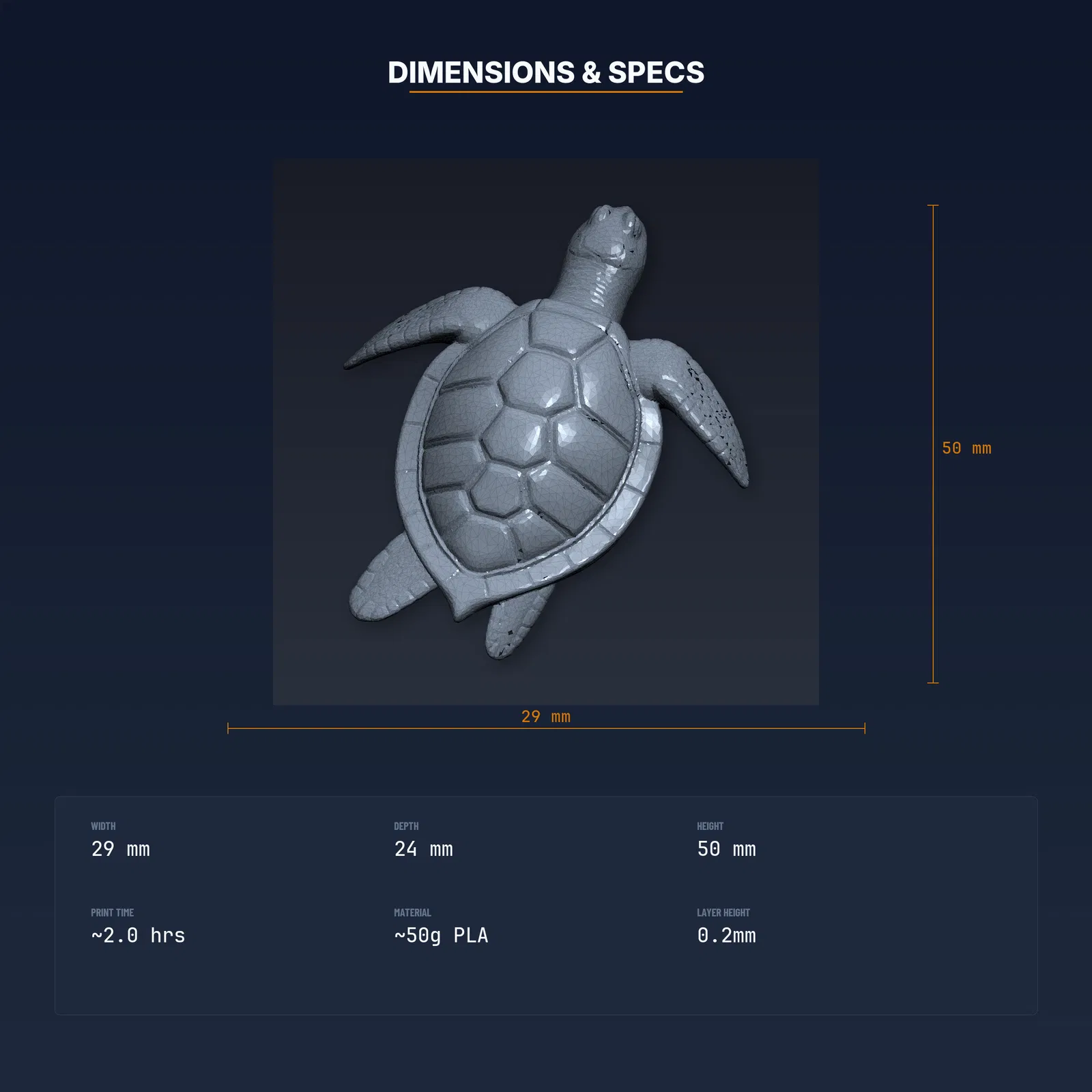 Thiết kế Sea Turtle Wall Sculpture độc đáo để in 3D, đã test trên hơn 8 máy FDM. Gồm STL/3MF/OBJ và print guide kèm setting. Kích thước 28.6×24.1×50.0 mm, khuyến nghị PLA (PETG cũng ổn).