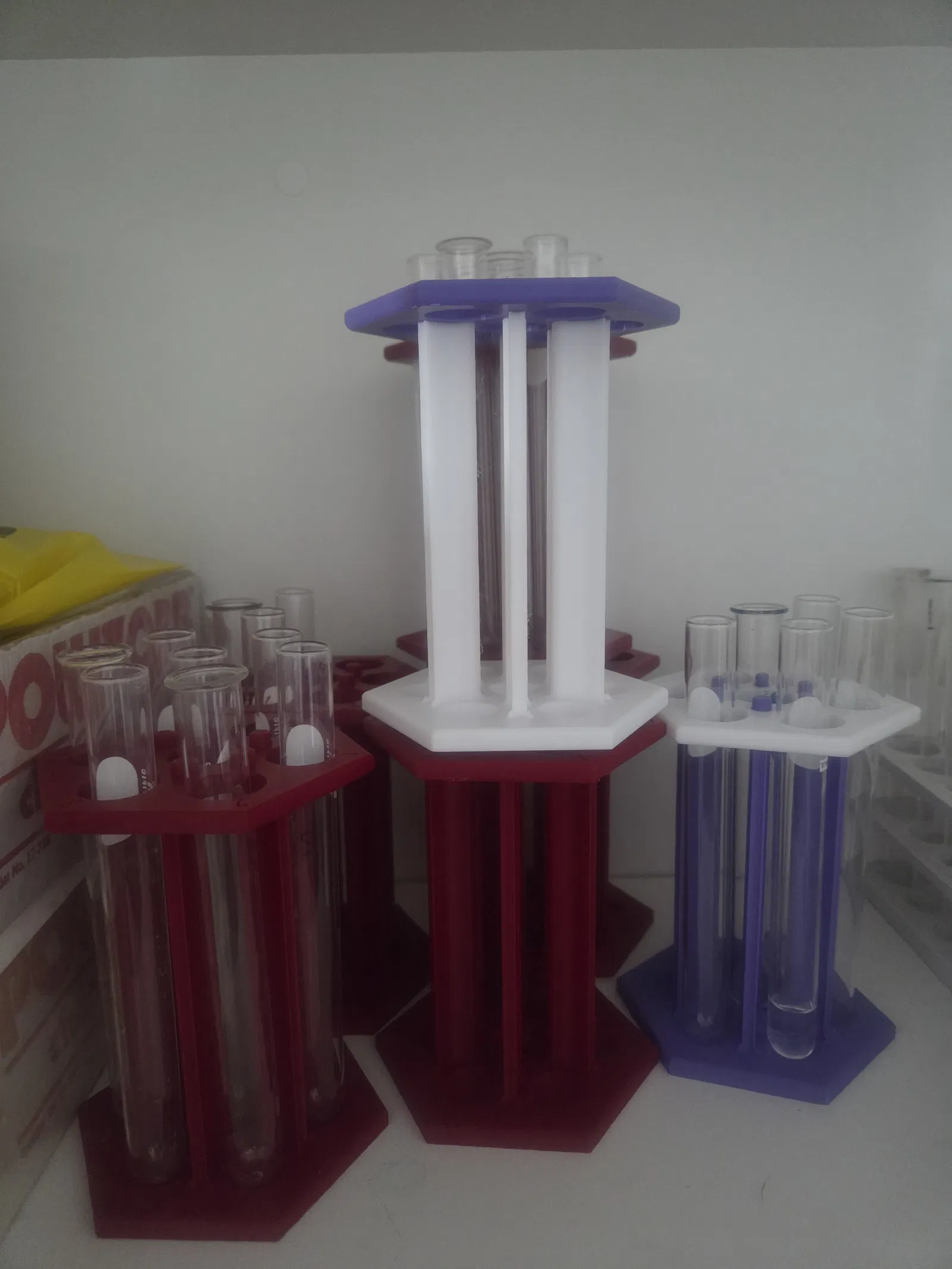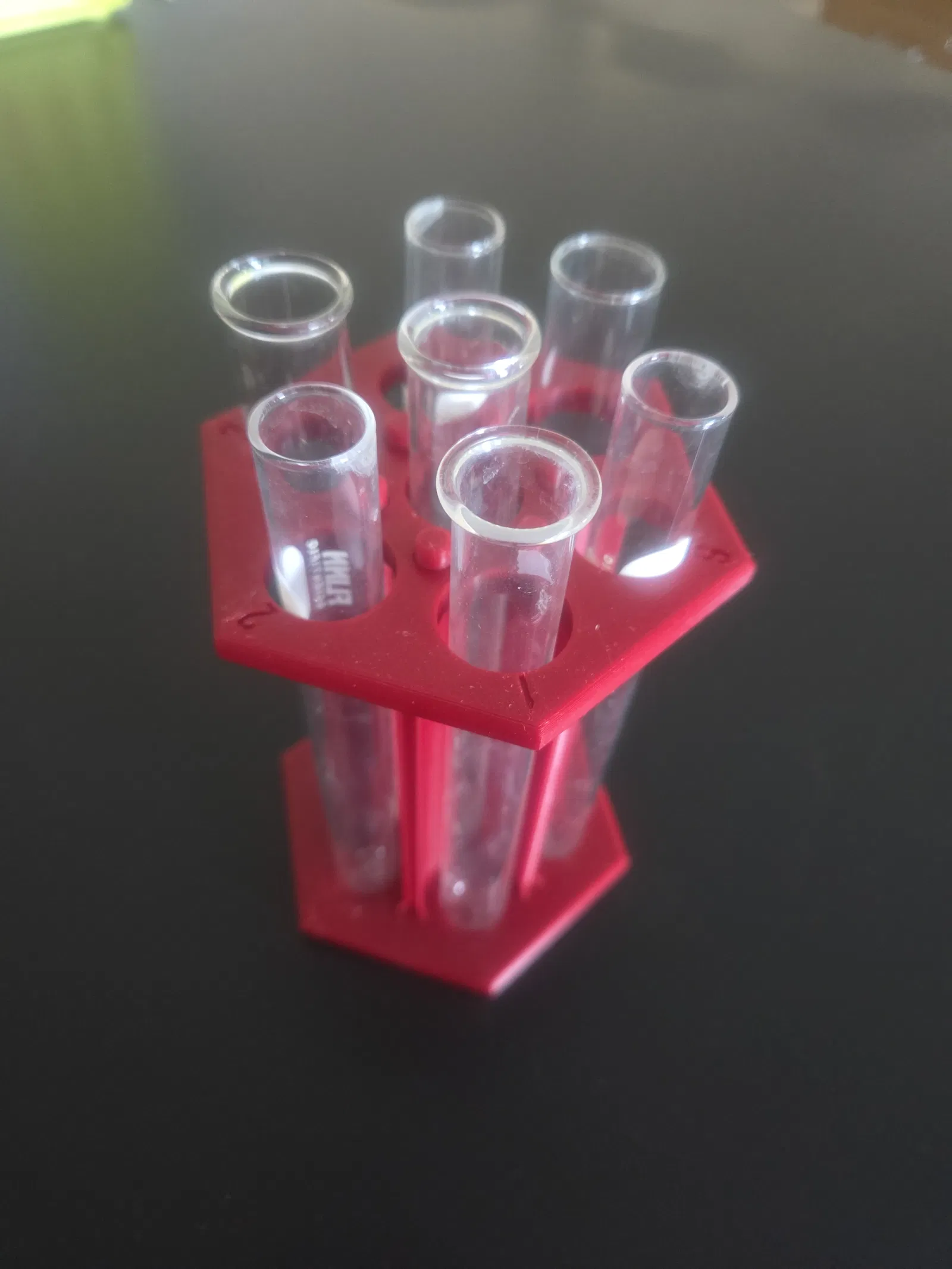 Thiết kế dạng lục giác giúp mình cất được nhiều giá hơn — và nhiều ống nghiệm hơn — trong cùng một không gian tủ như trước. Sau lần in đầu tiên, mình chỉnh lại phần trên và thêm số dọc theo viền ngoài để dán nhãn mẫu như đa số phòng lab vẫn làm. Khi cắm đầy ống, thiết kế này xách/carry đi quanh phòng cũng rất tiện. Thay vì phải cầm một đầu của giá, cả cụm có thể nắm chắc gọn một lần là được.
