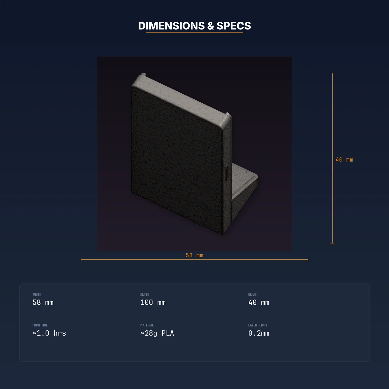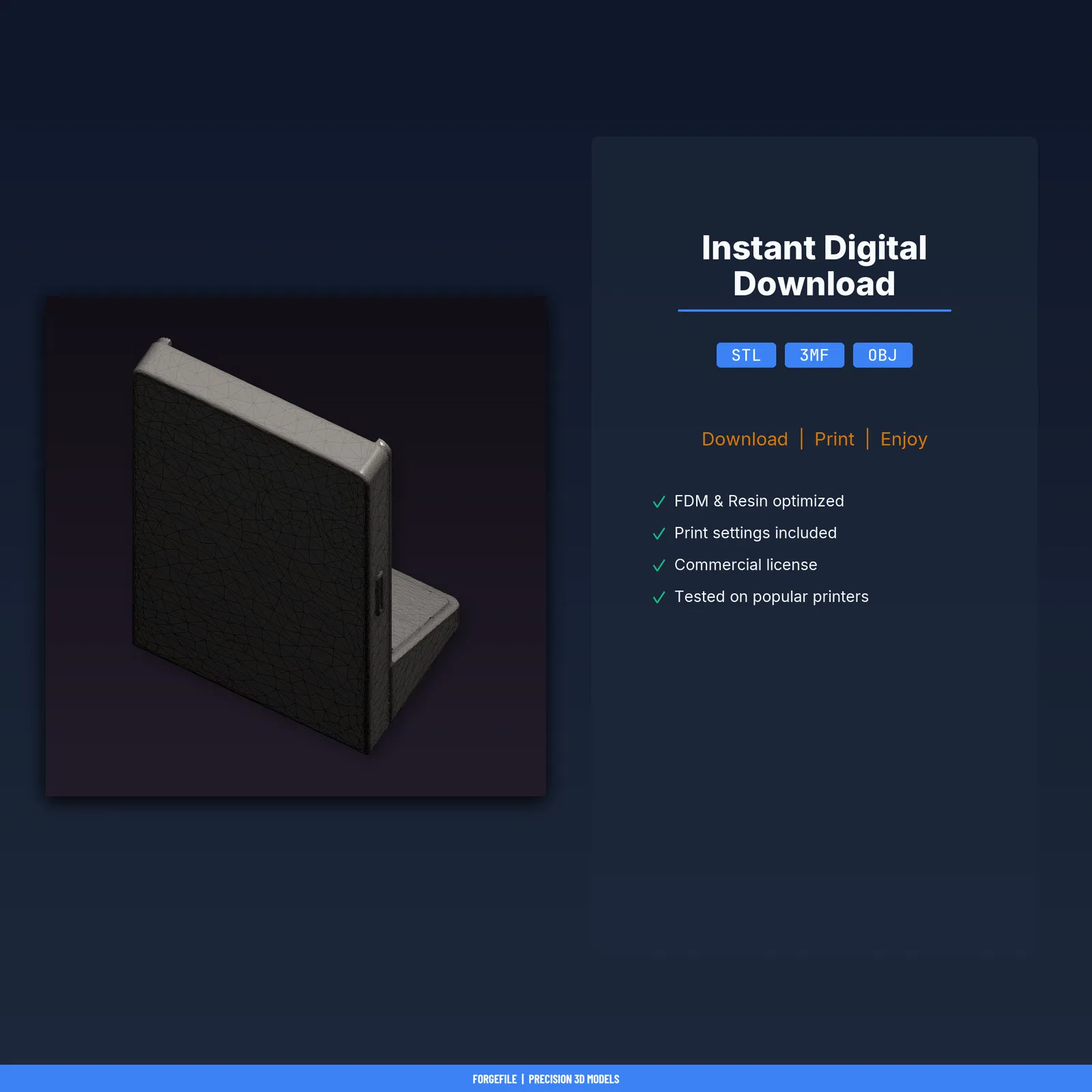 Kệ trưng bày băng game Retro 16-bit in 3D, đã test trên 8+ máy in FDM. Gồm file STL/3MF/OBJ và hướng dẫn in thông số chuẩn. Kích thước 57.6×100×39.8 mm, ~1 giờ in, ~29g PLA. Có license thương mại.
