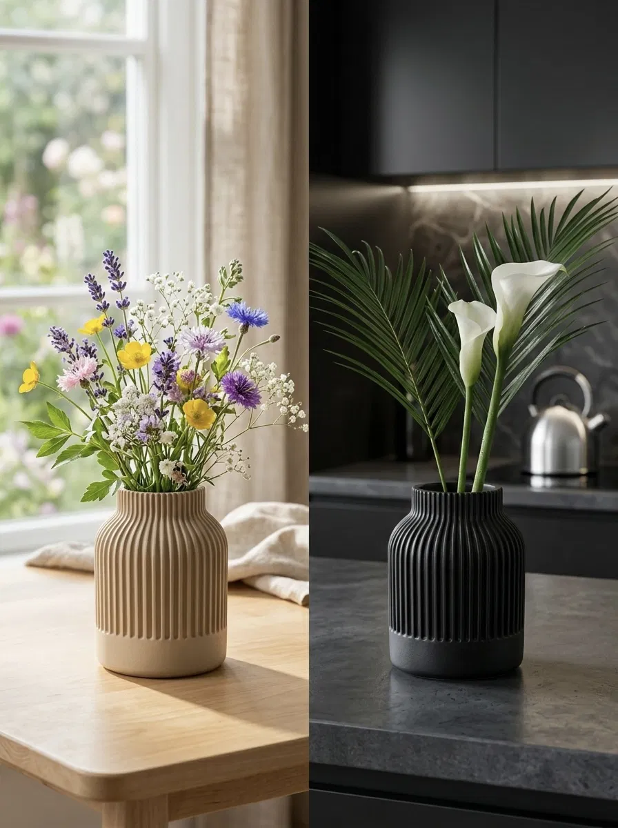 “Vase Allora”: Một thiết kế bình hoa 3D in được mang phong cách vượt thời gian, với các đường gân (ribbing) sắc nét, đều đặn.