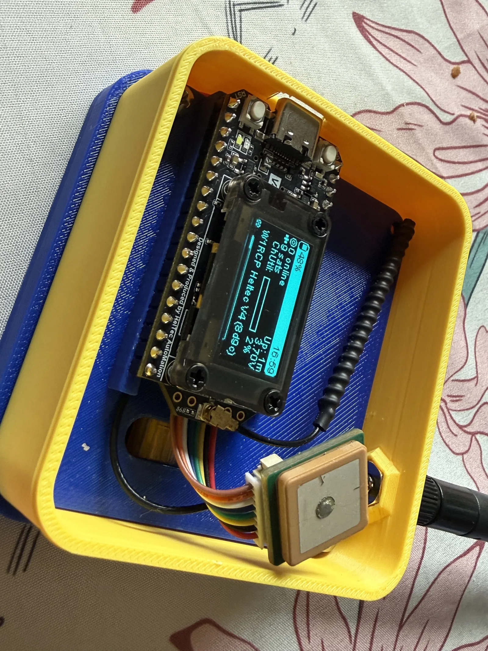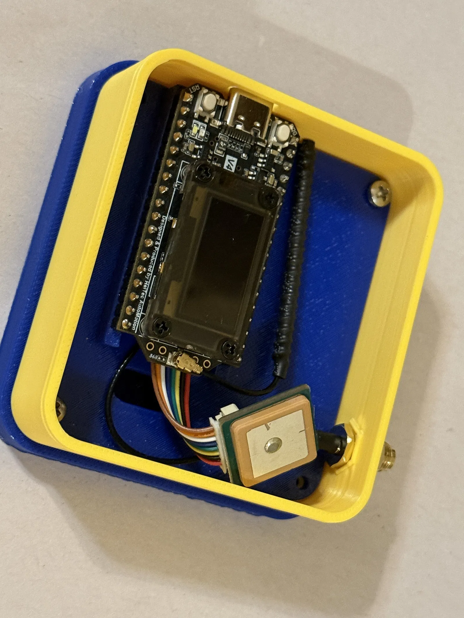 Cách lắp: đặt pin vào đáy enclosure. Sau đó cắm các anten vào board Heltec. Luồn anten ngoài qua lỗ và siết cố định bằng long đền và ê-cu đi kèm. Cắm pin vào board Heltec. Gắn các chân DIP của board Heltec vào bệ (platform), rồi đưa cả bệ và board vào trong hộp. Bắt chặt bằng 2 vít M3. Sắp anten nằm gọn trong phần trên của enclosure, rồi bắt nắp lên trên.