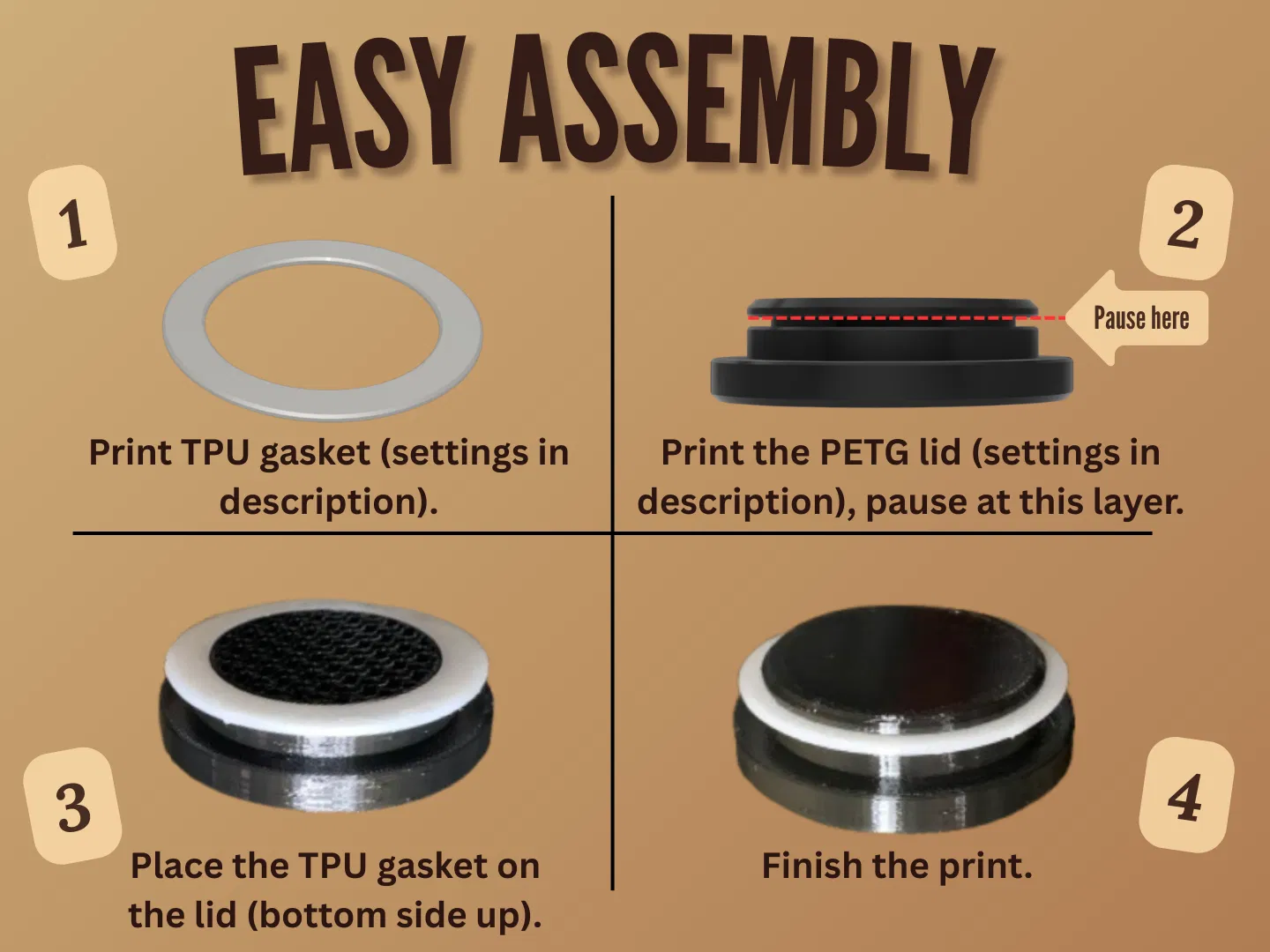 Nắp PETG (PETG lid): 2 bottom layers, 2 top layers, 2 walls trở lên, infill 20%, không cần supports và tùy chọn random seam position (nhìn đẹp hơn). Nhớ pause bản in ở lớp (layer) được ghi trong hình 2!