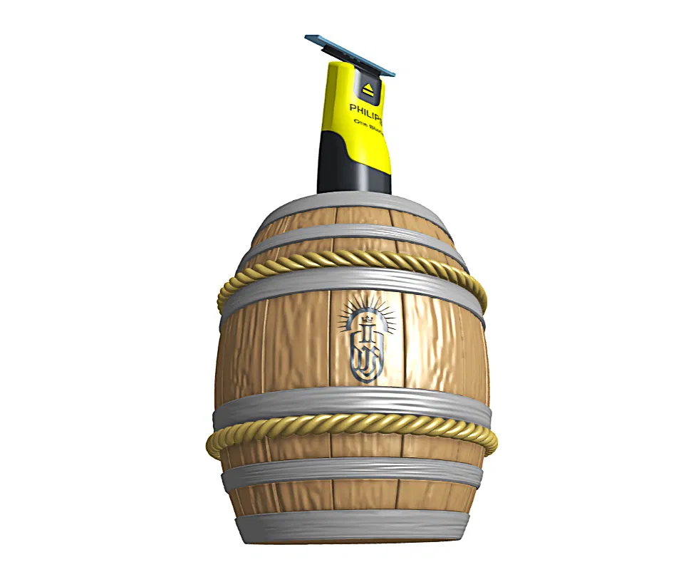 Một món khác lạ theo chủ đề Philips OneBlade—lần này là một thùng gỗ cũ kiểu rèn (forged) dùng làm stand.