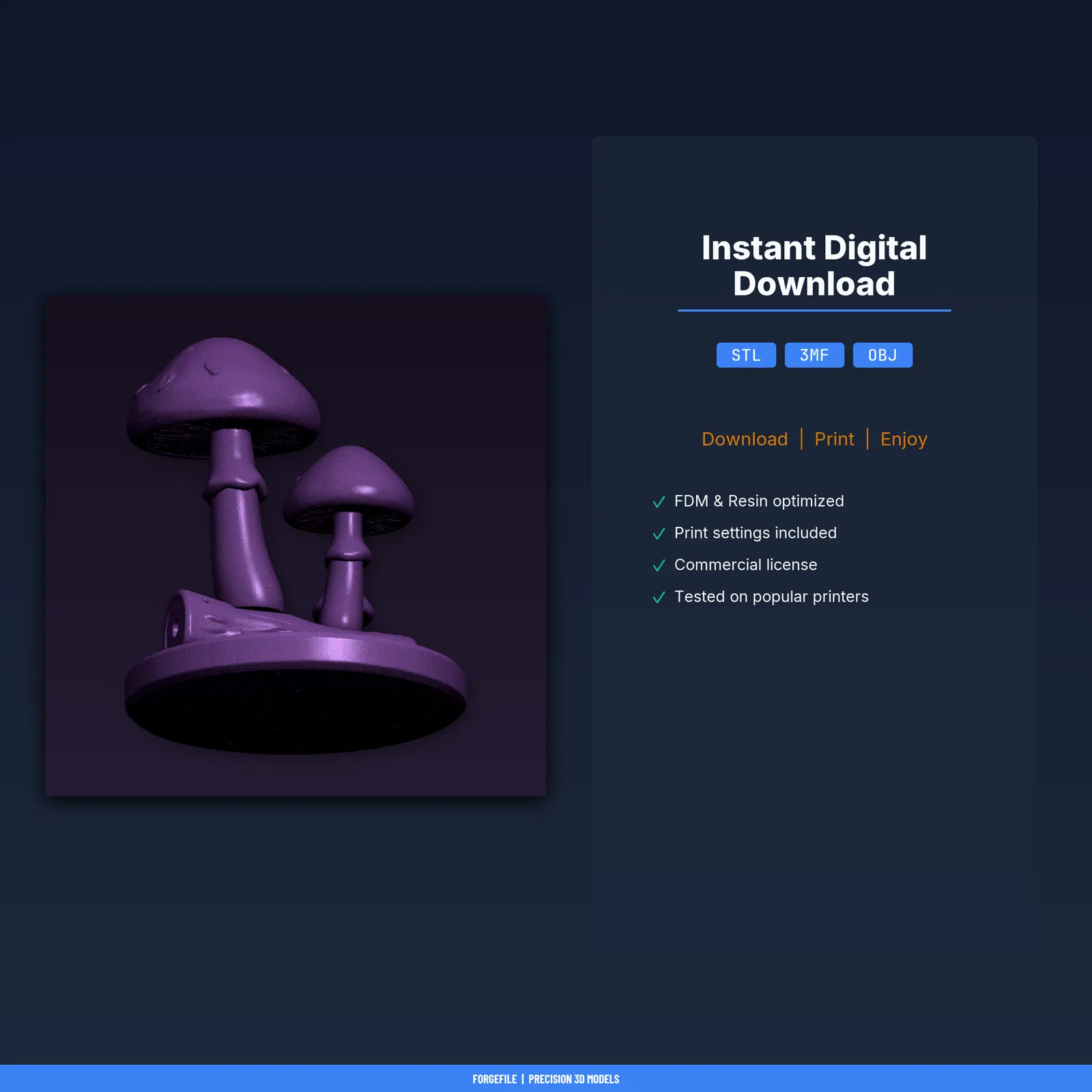 Mẫu Glowing Mushroom Cluster Nightlight độc lạ, tải về in ngay. Gồm STL/3MF/OBJ và print guide thông số đã test. Kích thước 44.3×50.0×44.2 mm, khuyến nghị PLA; đã test trên nhiều máy FDM.
