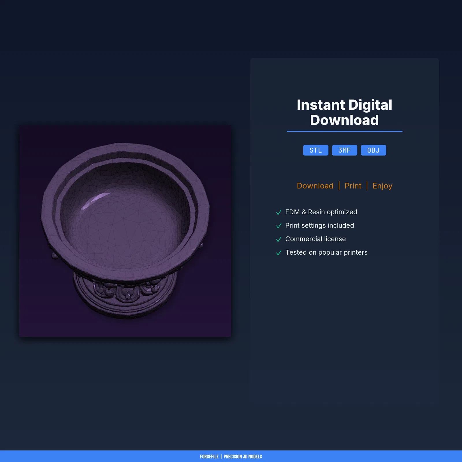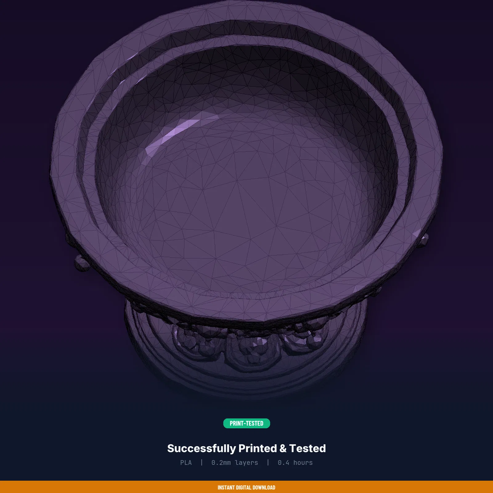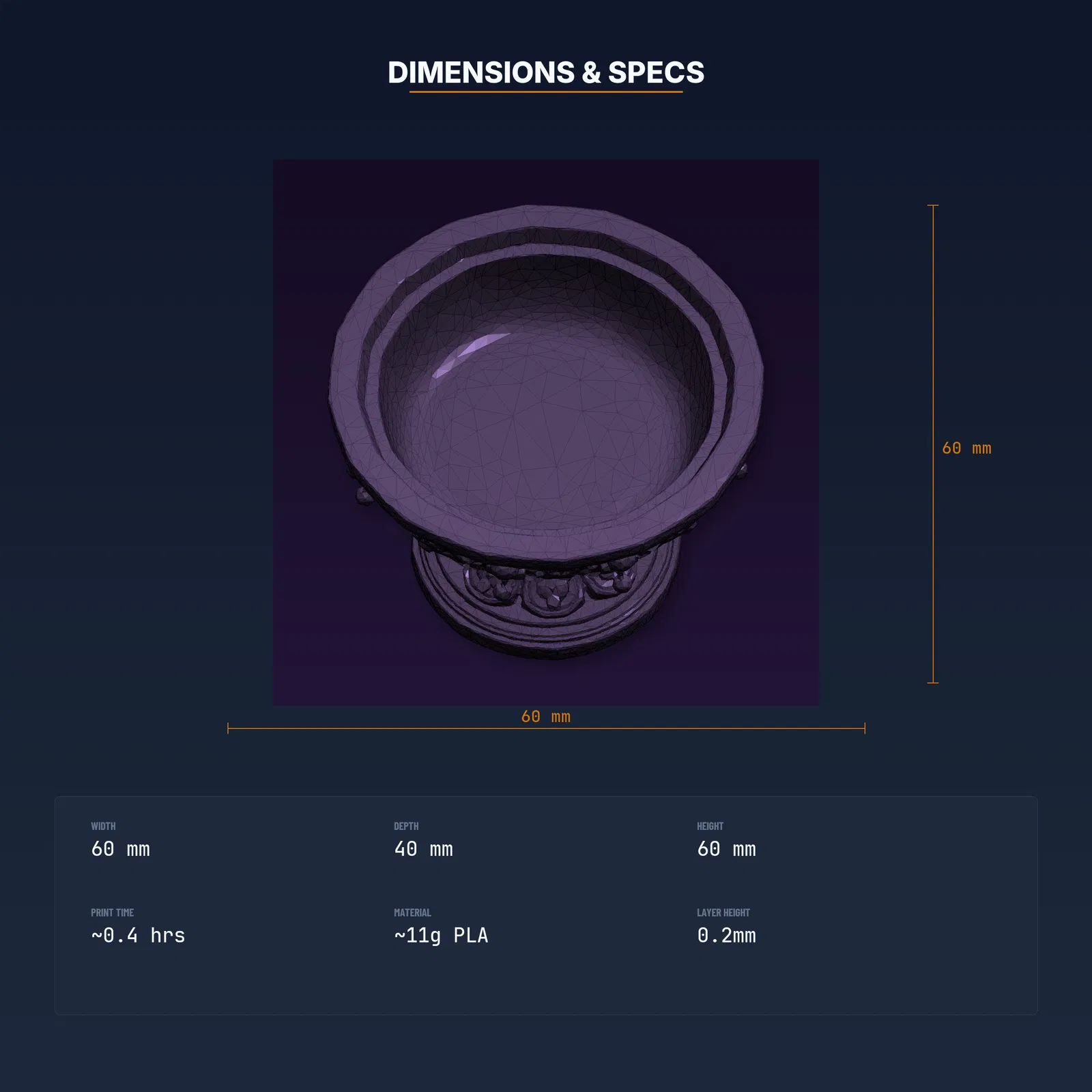 Gothic Altar Bowl là mẫu 3D độc đáo, tải về in liền với STL/3MF/OBJ và Print Guide thông số đã test. Kích thước 60 x 40.2 x 60 mm, ~0.4 giờ in, ~12g PLA; hỗ trợ khi cần, infill 15–20%.