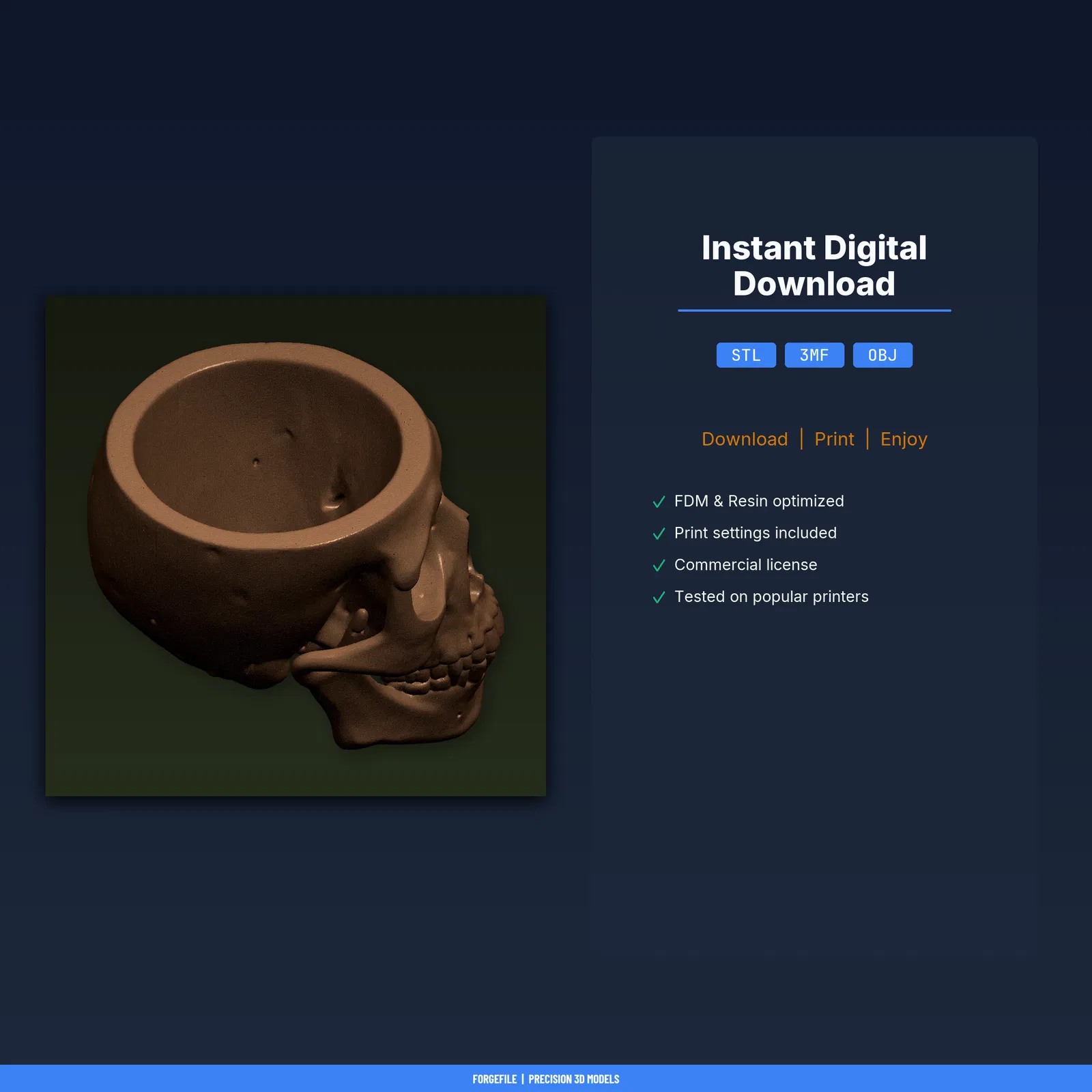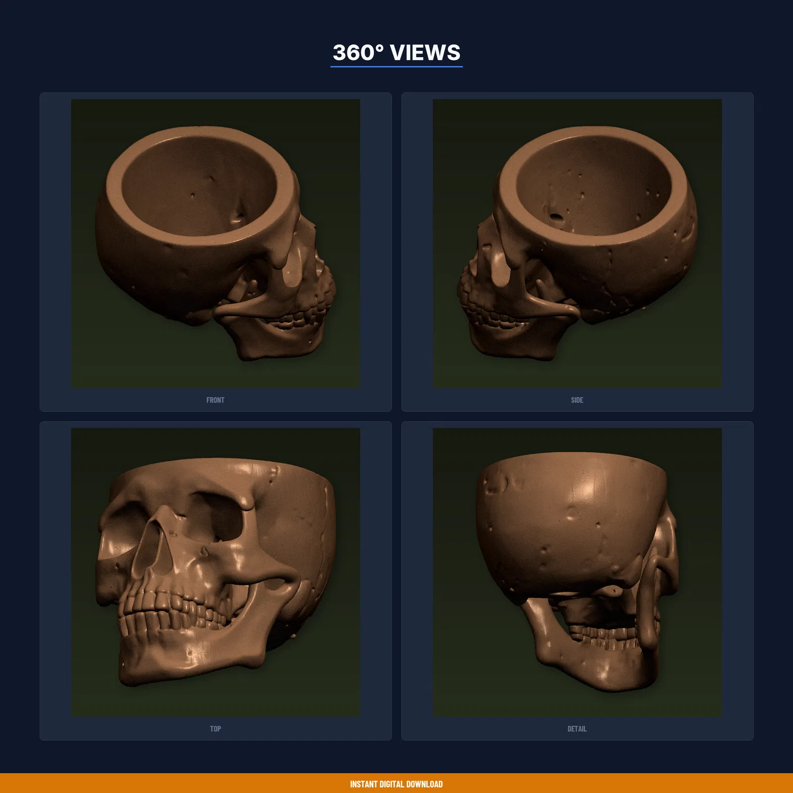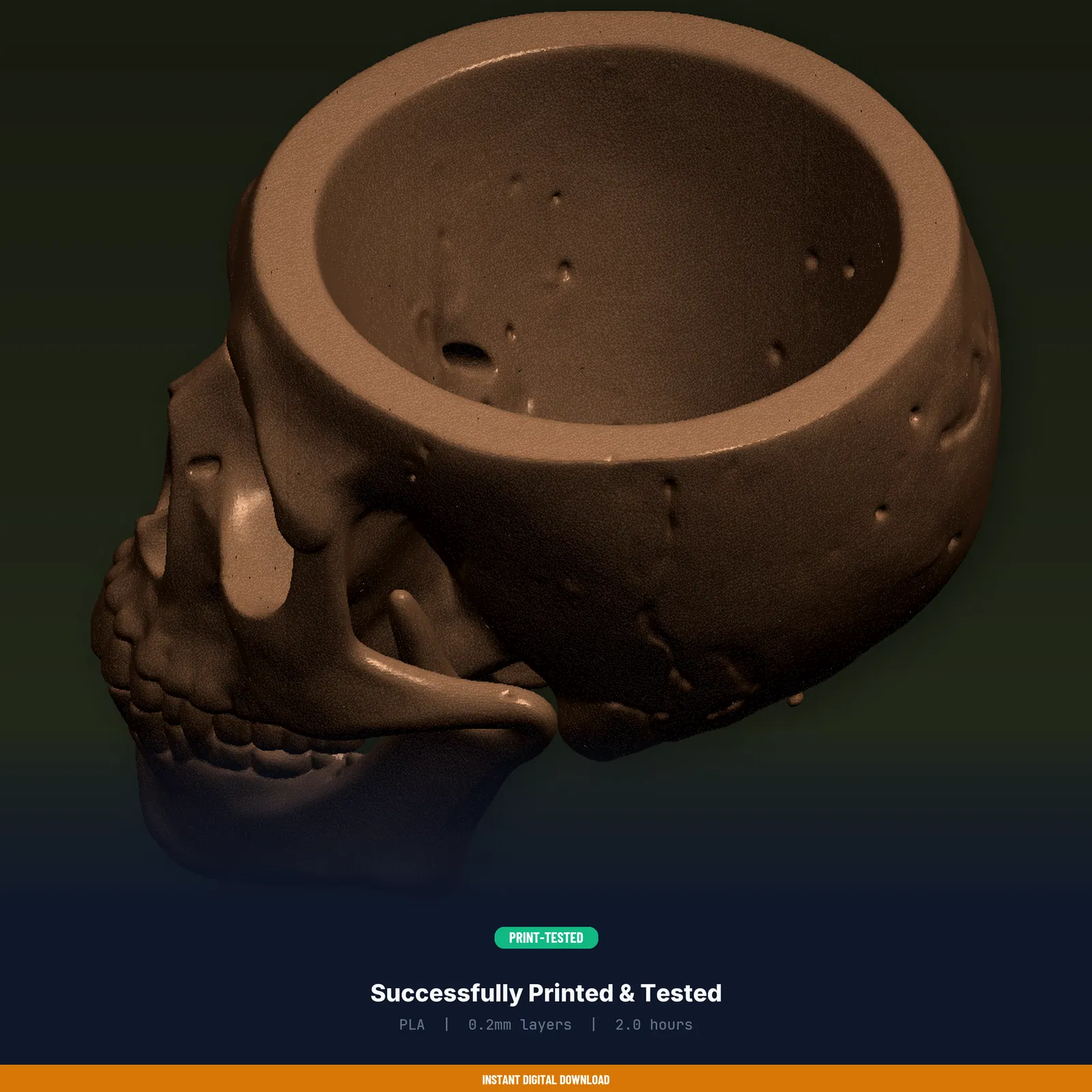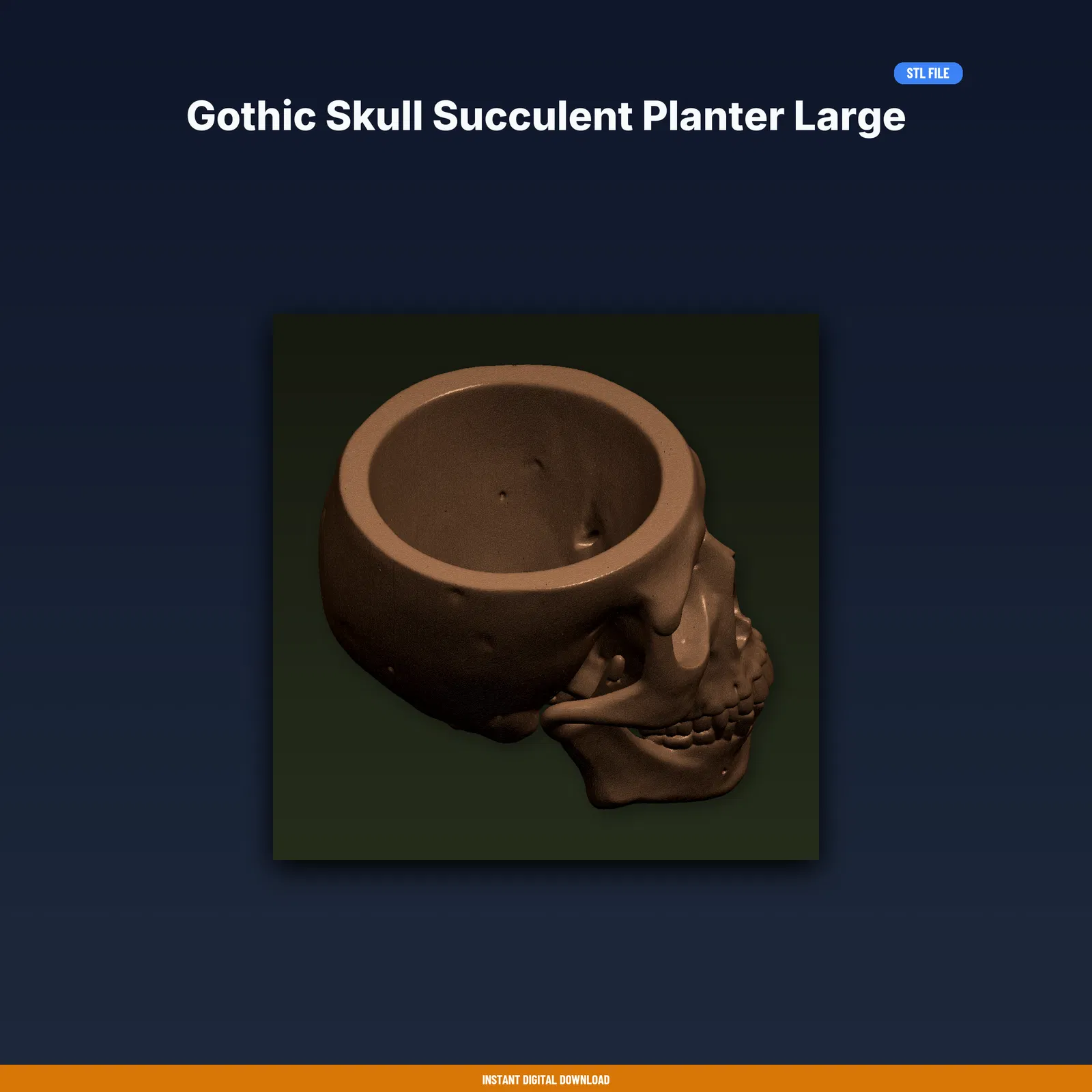 Thêm chút xanh cho góc làm việc bằng chậu sen đá đầu lâu phong cách Gothic cỡ lớn. Gồm STL/3MF/OBJ và print guide thông số đã test trên nhiều máy FDM. Kích thước 100 × 82.6 × 78.8 mm; khuyến nghị PLA.