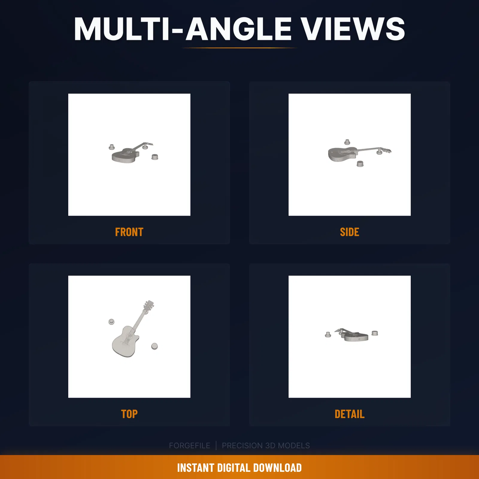 Dọn gọn không gian với móc treo guitar gắn tường ôm vừa khít, yoke có đệm giúp giữ đàn chắc khi trưng bày. Có STL/3MF/OBJ và print guide; thông số 0.2mm, infill 15–20%, PLA/PETG.
