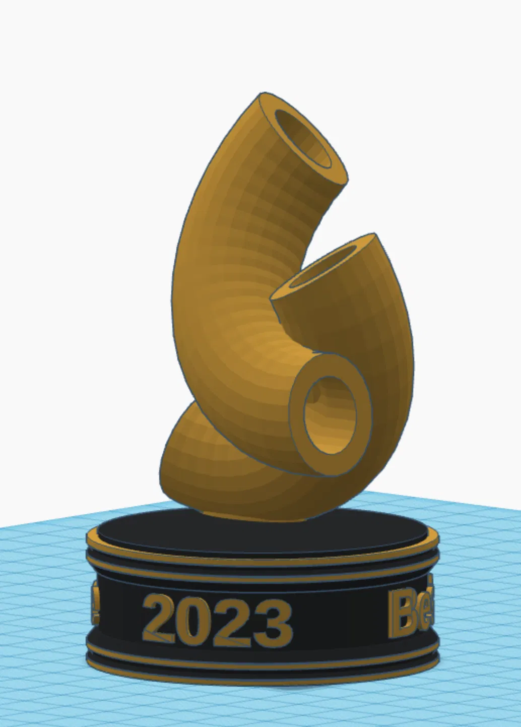Bên mình làm mấy cái cúp này cho một sự kiện nội bộ. Mình gợi ý dùng đổi màu theo layer height, rồi tô phần chữ bằng bút Sharpie màu vàng; hoặc in toàn bộ bằng màu đen, che mask, rồi xịt sơn màu vàng (gold spray paint).