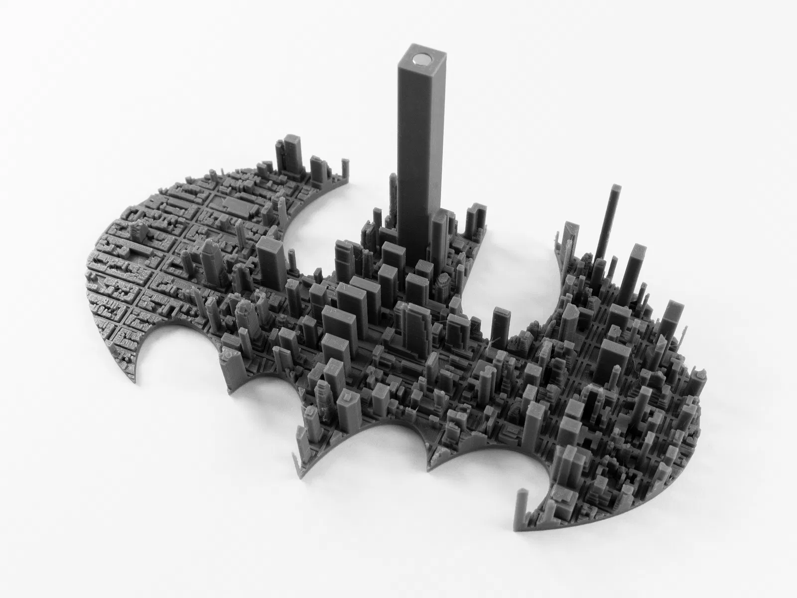 Mẫu trưng bày Batwing (Batman 1989) bay trên nền Gotham City lấy cảm hứng Manhattan. Thiết kế in mượt, không cần supports, có nhiều print profile; tùy chọn gắn nam châm 6×2mm để cố định lên stand.