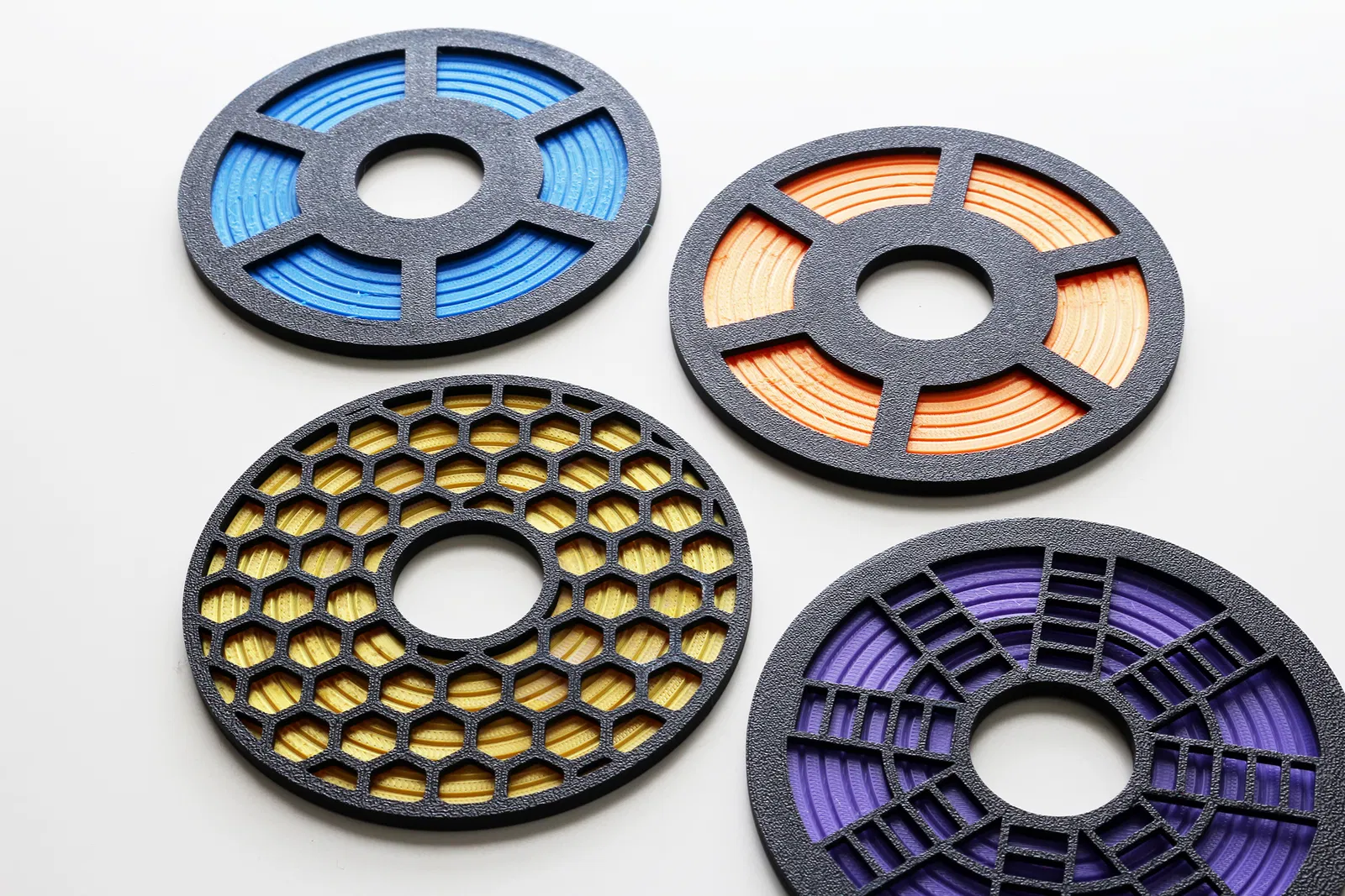 Đây là bộ lót ly (coaster) theo chủ đề 3D printing, in ra thành 2 phần riêng và nhìn giống như một cuộn filament. Mẫu này in dễ, không cần supports.