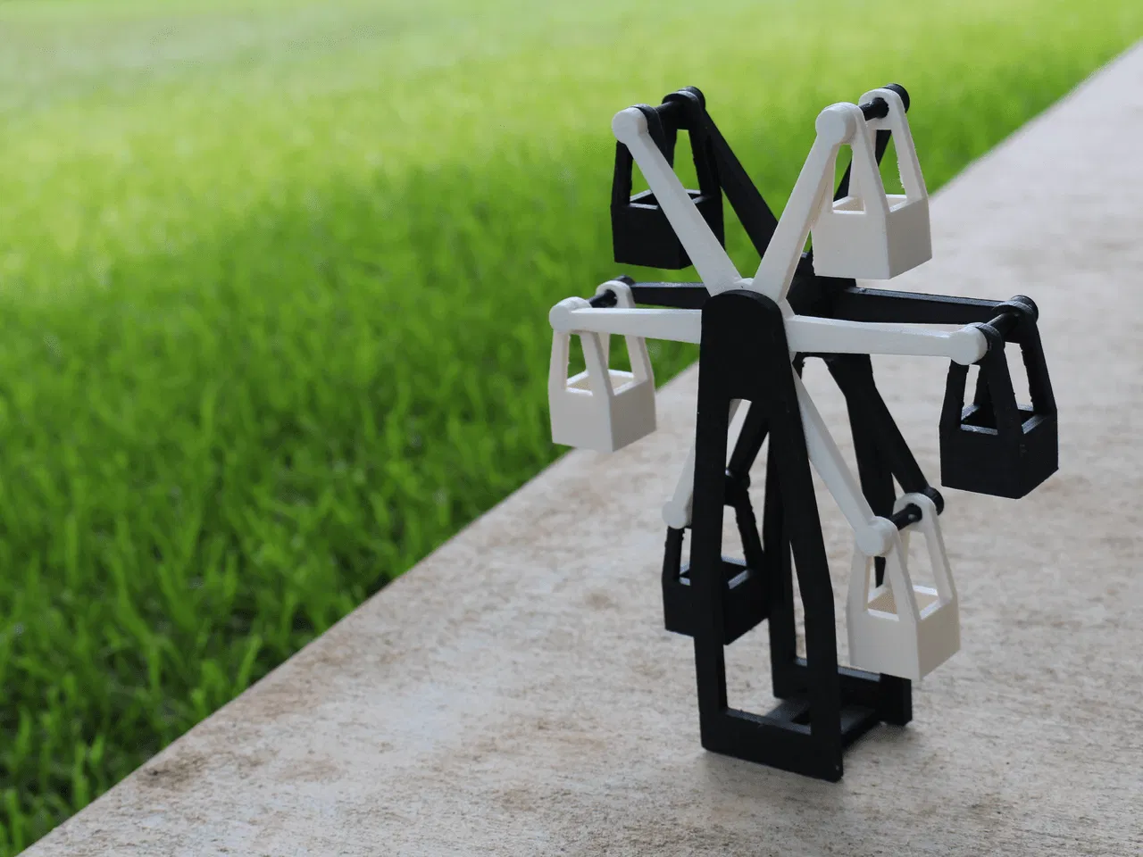 Mẫu chậu trồng cây 3D print hình Ferris Wheel dễ in, không cần support. Gồm 3 file STL để in nhiều màu, lắp bằng keo siêu dính; các tay quay xoay trơn, giữ chậu nhỏ cho sen đá mini hoặc microgreens.