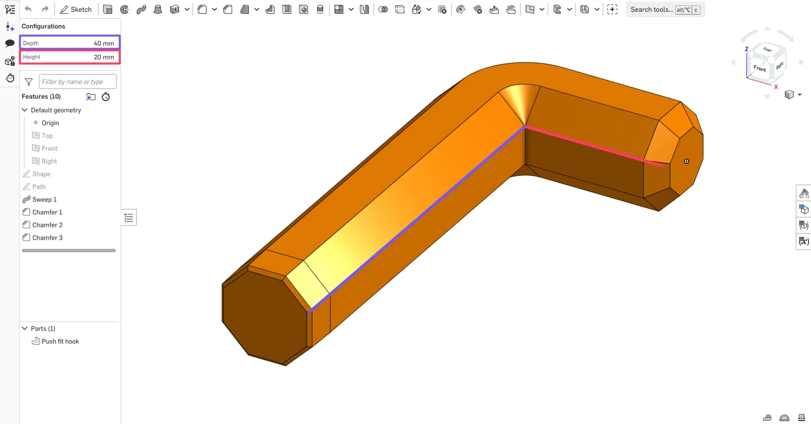 Móc push-fit có thể tùy chỉnh cho Multiboard, thiết kế parametric trên Onshape. Cho phép chỉnh inner height và inner depth (không tính phần nằm trong snap; đã cộng thêm 15mm). Có bản elbow bo tròn và bản elbow vát chamfer.