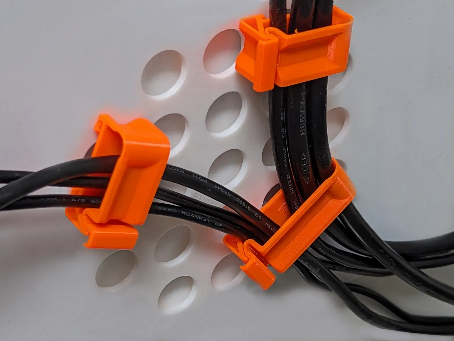 Mỗi lần mình đủ “độ lì” để chốt một phương án cable management cố định cho góc máy, thì chưa tới hai tuần là lại tháo ra vì mình vừa thêm/bớt phần cứng, làm đường đi dây trước đó thành không còn hợp nữa. Vì vậy mình làm ra hai mẫu kẹp cáp KLAMMA và bản kế nhiệm là KLIPPT. Hai mẫu này cho phép đi dây rất linh hoạt trên các bề mặt mà bạn có thể dán keo hoặc bắt vít bằng base plate tiêu chuẩn. Phần dây hay bị bừa nhất của mình lúc nào cũng là đoạn từ gầm bàn lên tới máy.