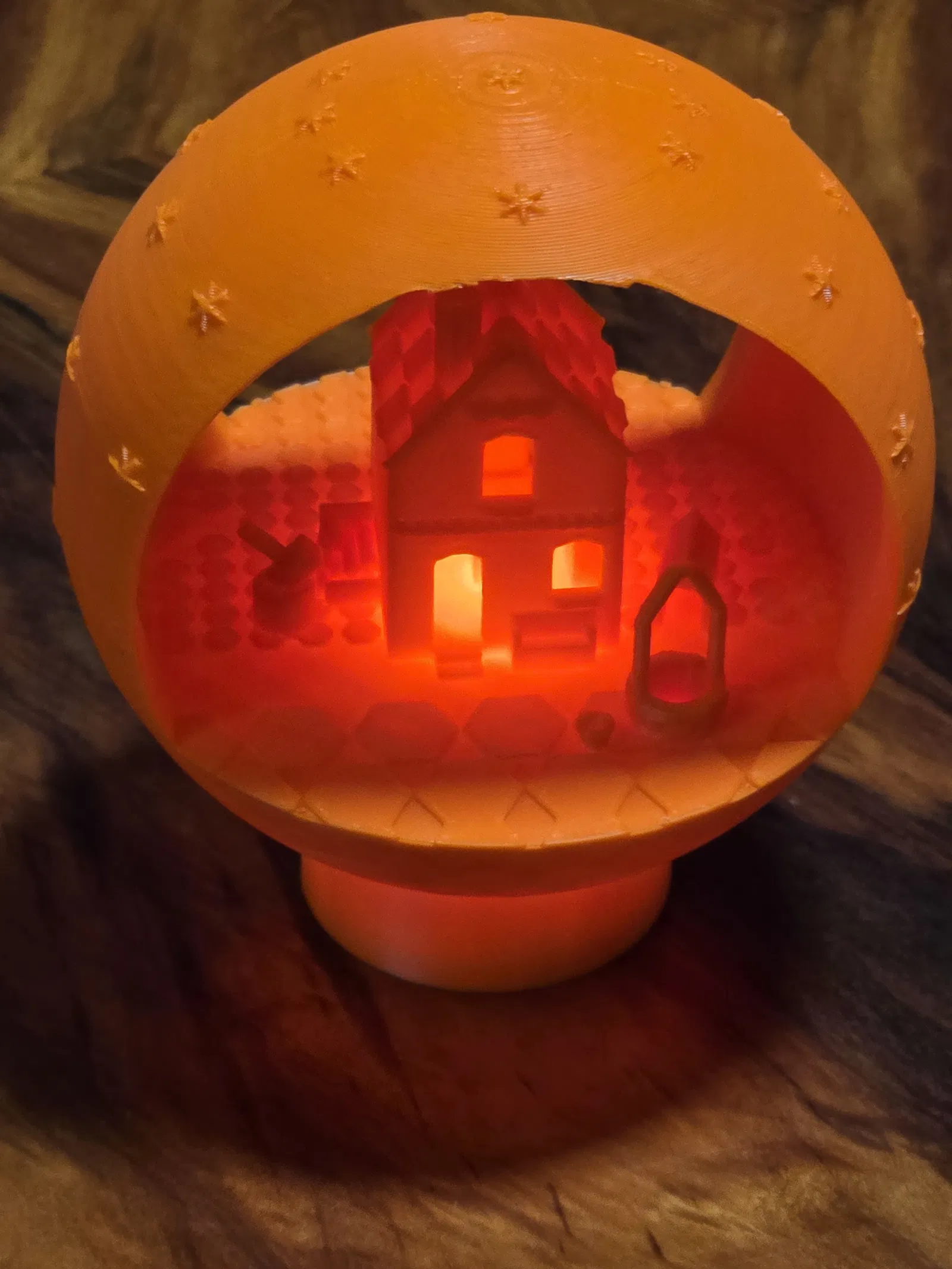 Weihnachtskugel là quả cầu Noel nhỏ có chiếu sáng bằng nến tealight. Khuyến nghị in PLA, infill 10% (Gyroid để ánh sáng xuyên đẹp hơn), và chỉ cần support tối thiểu.