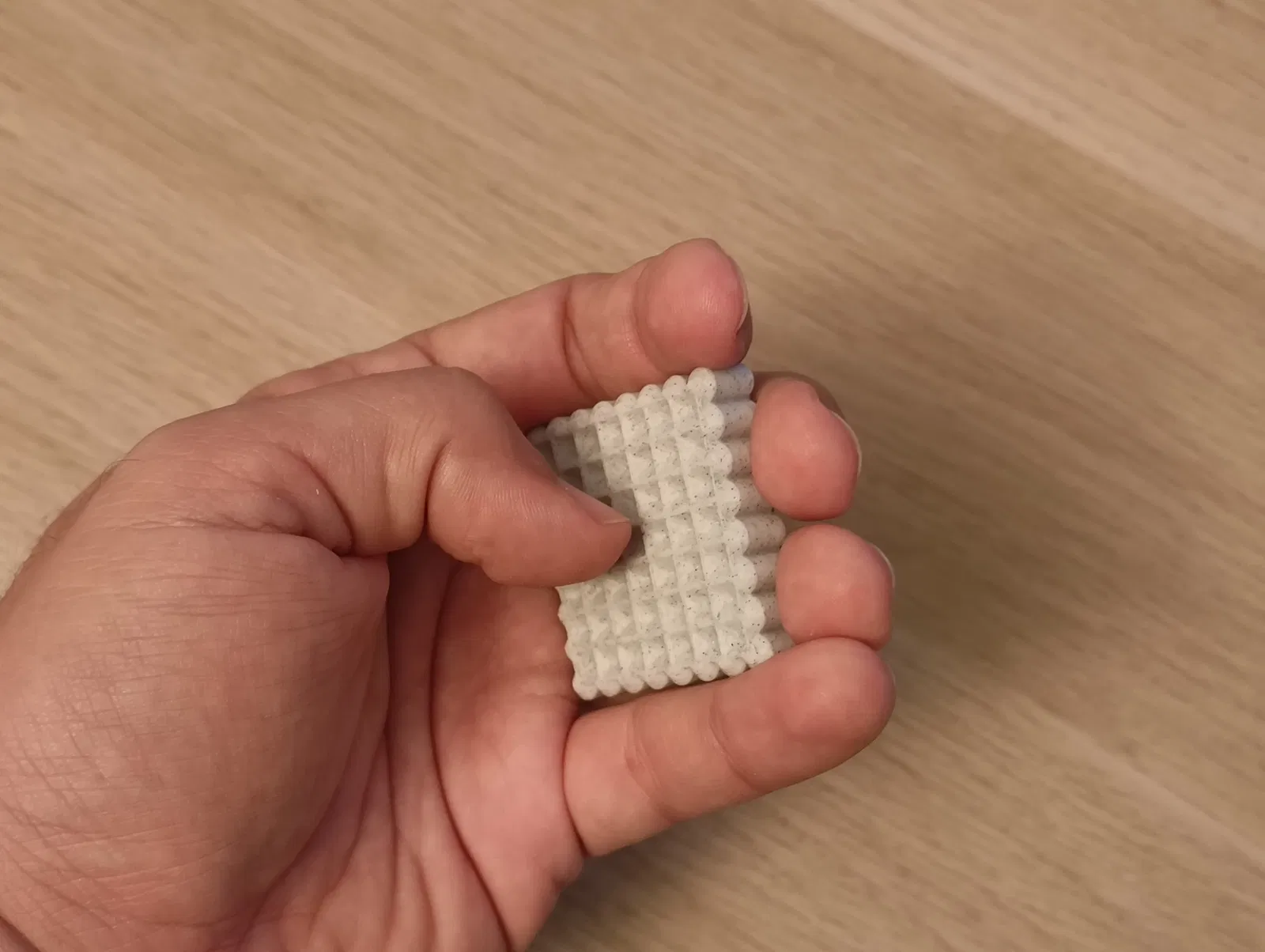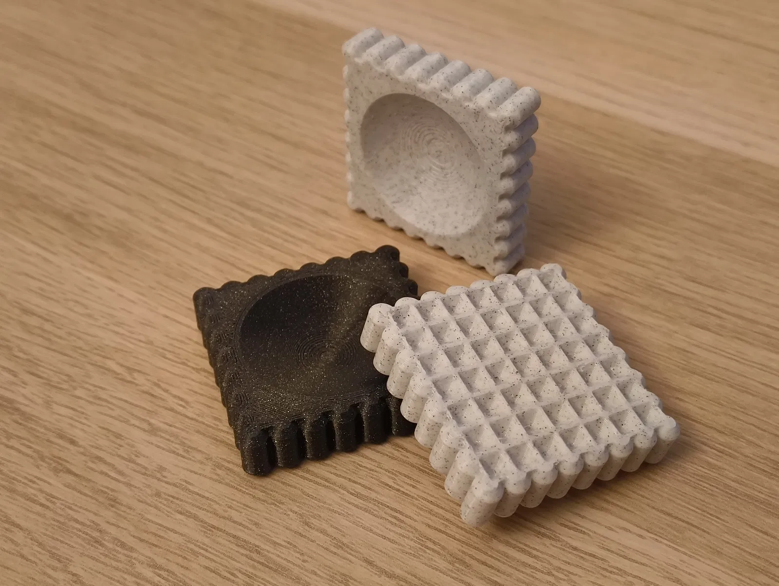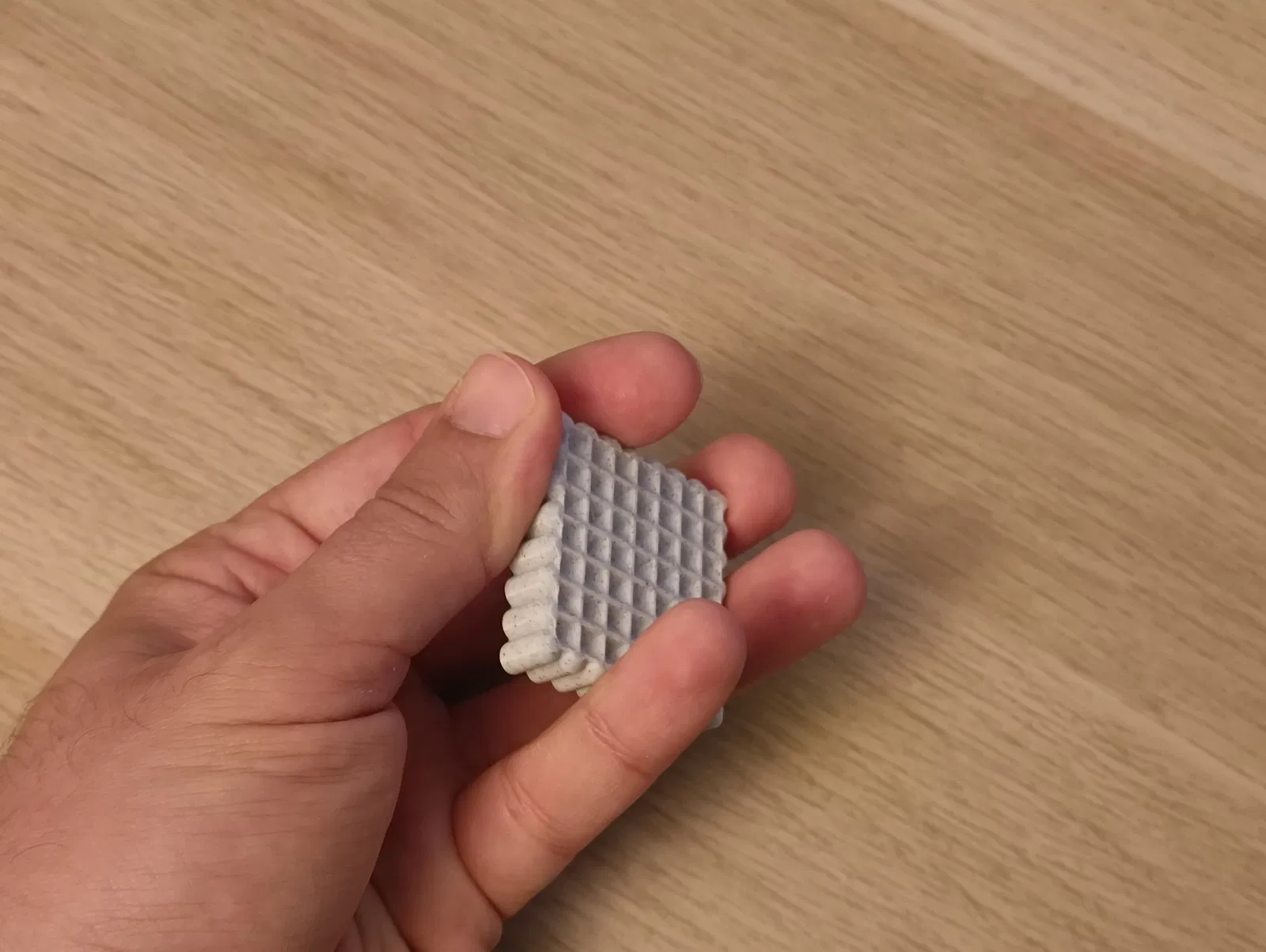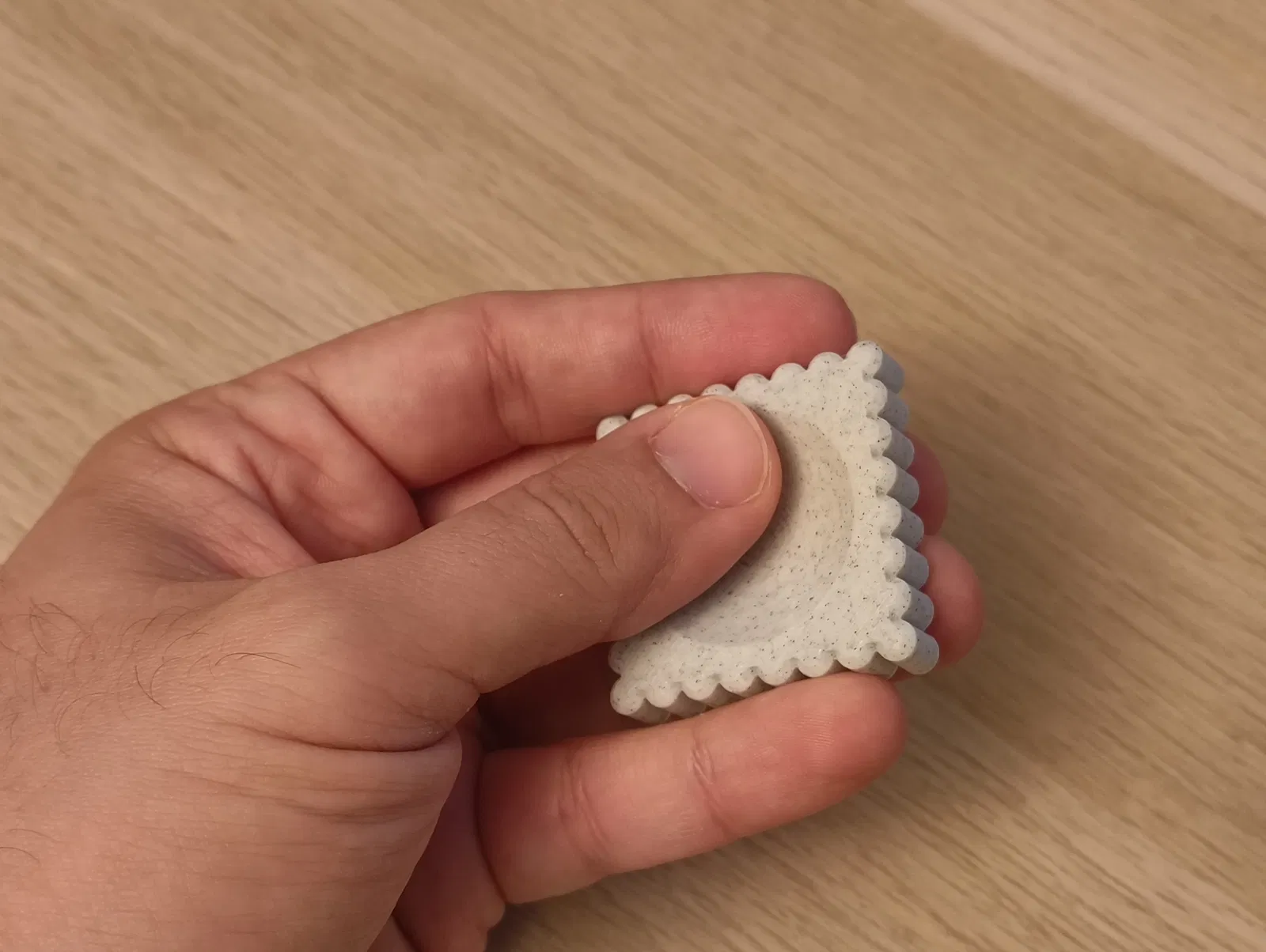 Worry Stone là món fidget đơn giản, không có chi tiết chuyển động, bề mặt texture dễ chịu. Có hõm để chà ngón cái, mặt lưới để cào bằng móng, và các gờ bên hông để sờ hoặc massage.