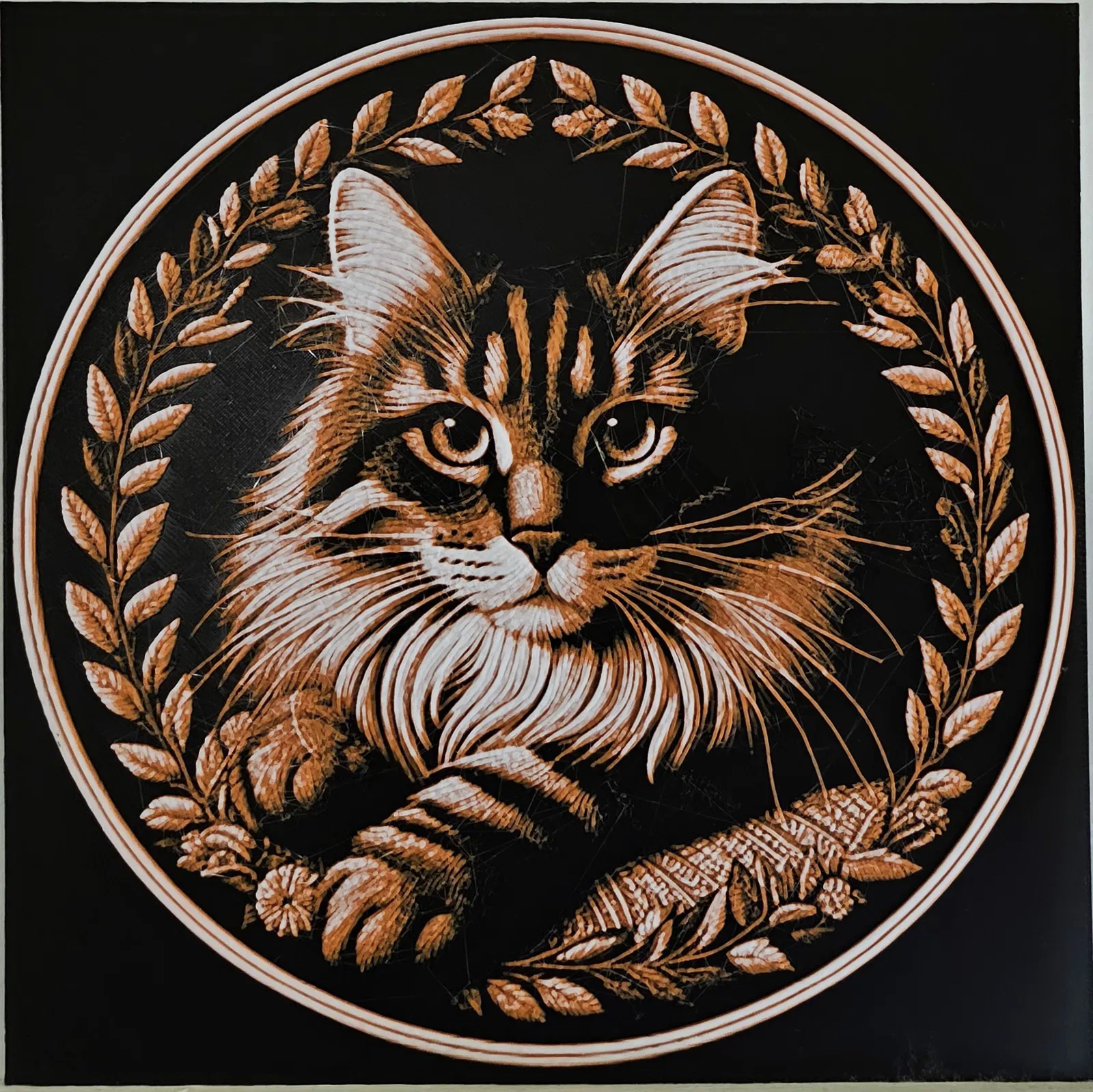 Tranh Hueforge hình mèo, tạo từ ảnh AI của tác giả. Hướng dẫn in 100% infill, layer height 0.08mm (base 0.16mm) và thứ tự đổi màu Black → ORANGE → White. Có kèm file tranh tròn không khung.