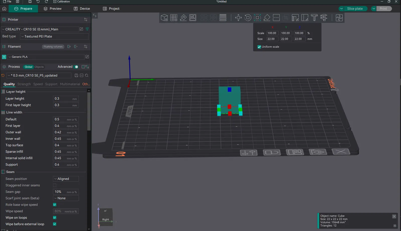 Profile ORCA đã được test kỹ cho Creality CR 10 SE với nozzle 0.4mm, tối ưu chất lượng và tốc độ in. Hỗ trợ PLA/TPU, có thể tùy chỉnh theo nhu cầu. Kèm hướng dẫn thêm custom bed texture/bed .stl.
