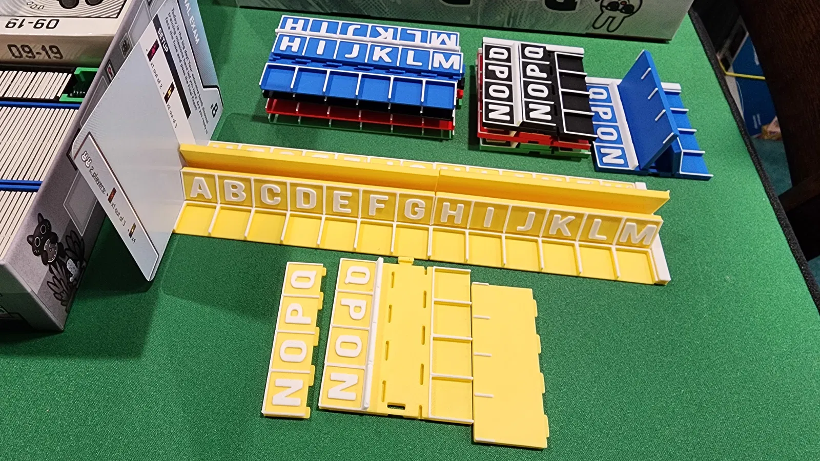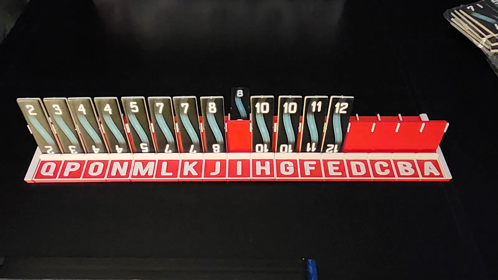 Ở đầu rack có một khe để đặt một tấm card vào, giúp che bớt các tile khỏi những người chơi khác ngồi cùng phía của bàn. Khi muốn bỏ vào hộp thì sẽ cần tháo rời rack ra mới vừa.