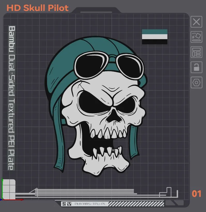 Nghệ thuật tường dày 1.8mm. 4 lớp ở mặt sau là màu đen và phần còn lại là chính cái đầu lâu phi công. Tốt nhất nếu in mặt xuống trên một tấm plate có kết cấu để có một bề mặt hoàn thiện đẹp. Cắt bằng eSlicer. eSlicer có thể gặp vấn đề khi mở tệp .3mf vì nó không tương thích. Đây là MMU.